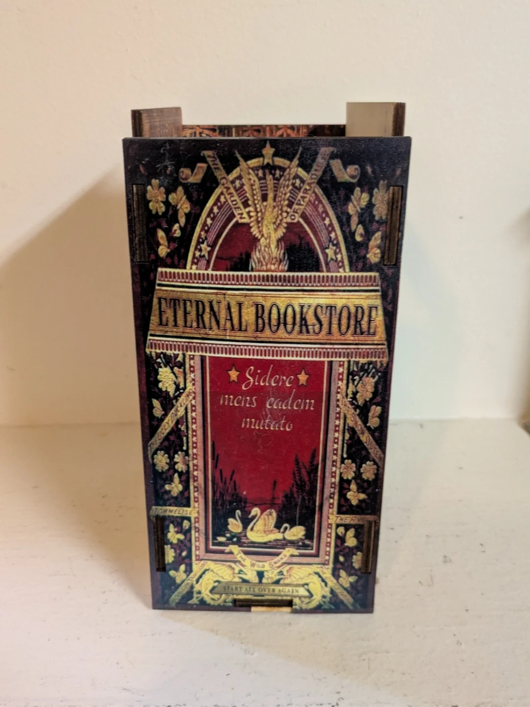 This is a miniature book nook kit, designed to look like an 'Eternal Bookstore'. It features a detailed interior with bookshelves and scattered books.