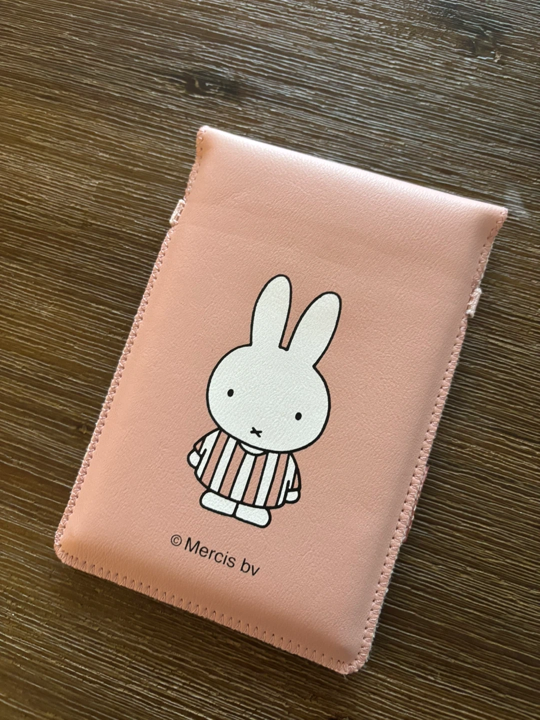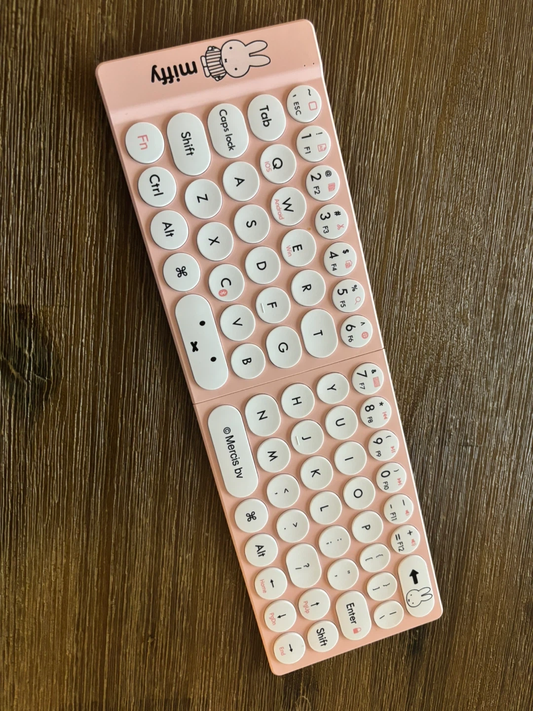 This cute pink Miffy Bluetooth keyboard comes with a matching protective sleeve. It's a compact and stylish accessory for your devices. The keyboard is wireless and features round keys.