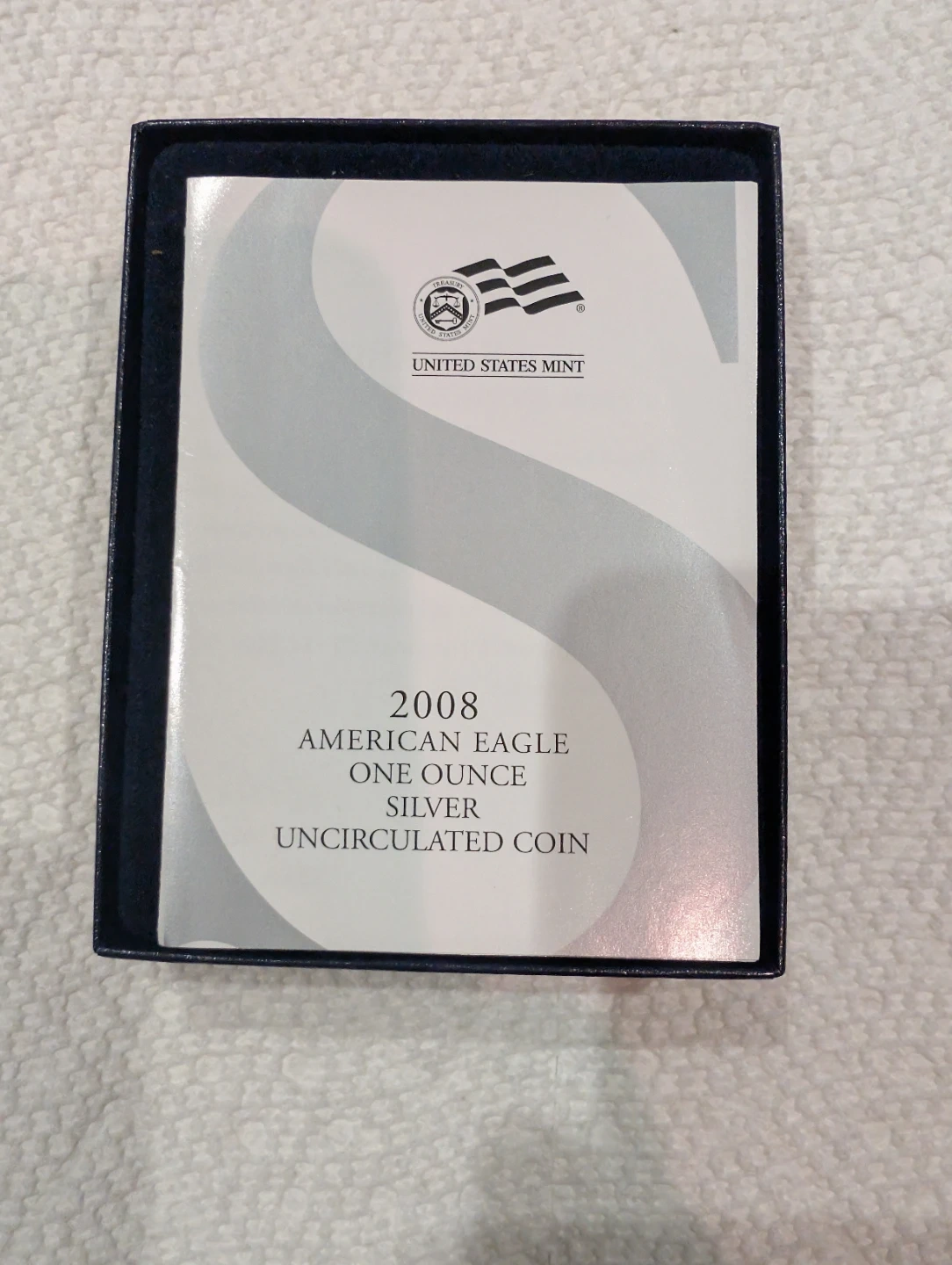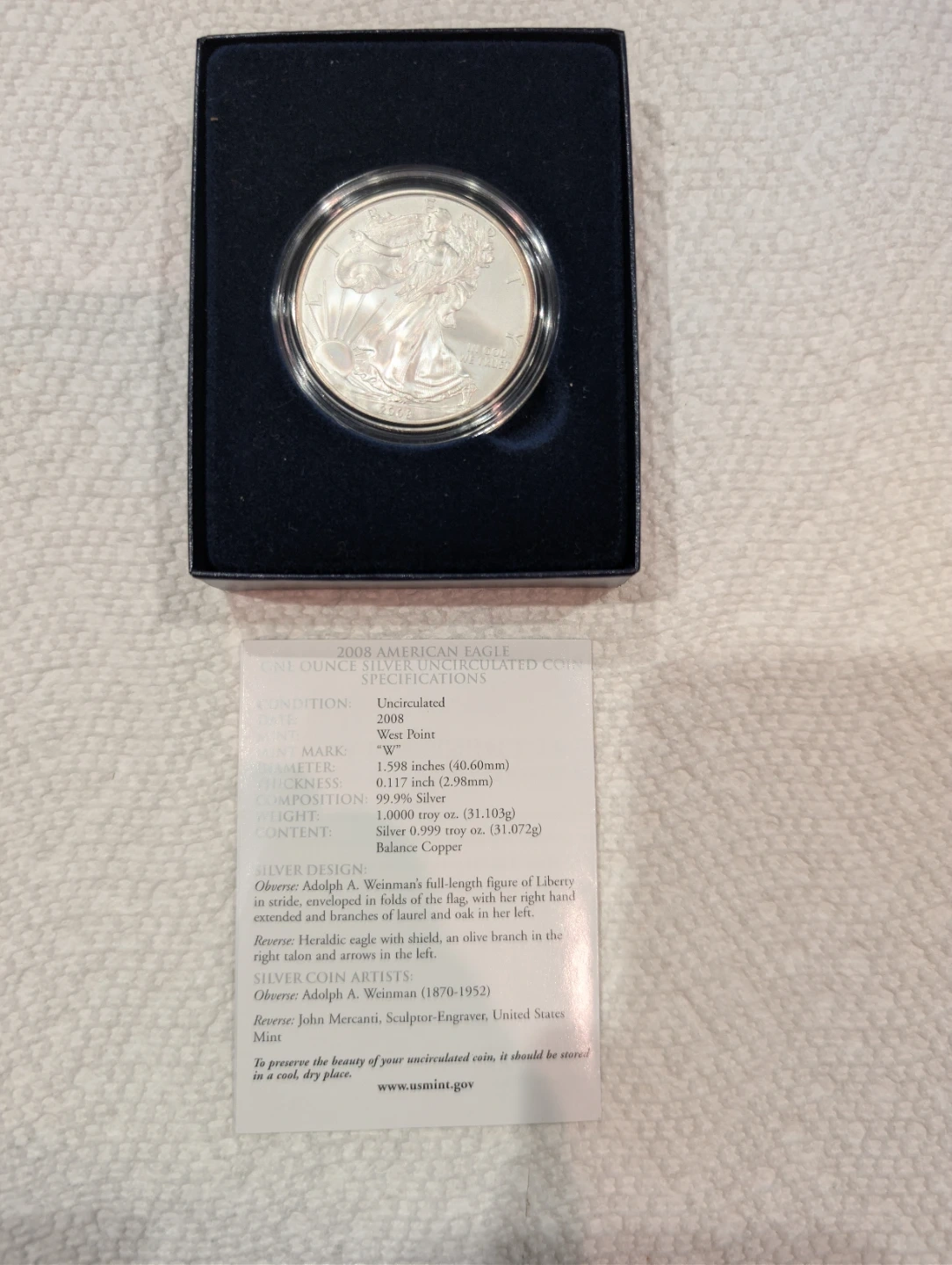 This is a 2008 American Eagle one ounce silver uncirculated coin. It's made of 99.9% silver and has a balance copper composition. It comes in its original box with a certificate of authenticity. Content Silver 0.999 Troy ounce (31.072 grams) mint in West Point.