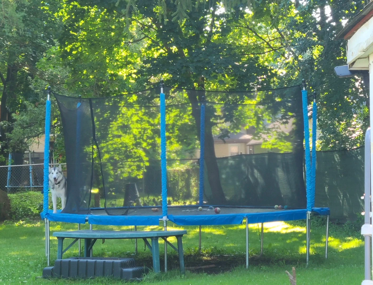 Get ready for some outdoor fun with this large trampoline! It's got a sturdy frame and a safety net enclosure to keep things secure. Some small balls are included too. It's great for bouncing around on sunny days! 16 foot paid well over $600 new with taxes few years old kids are teens best offer takes it.