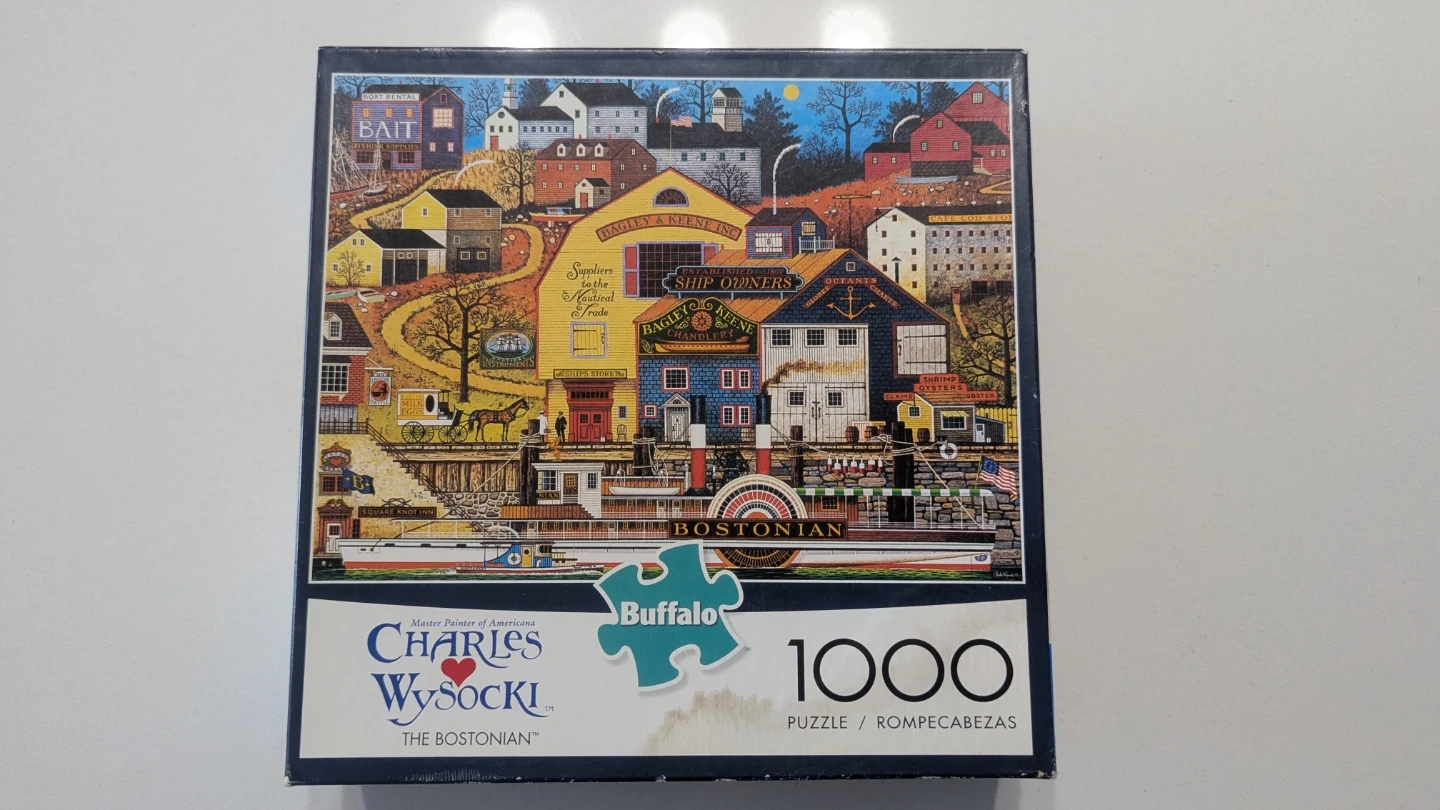 This Buffalo Games jigsaw puzzle features Charles Wysocki's artwork, 'The Bostonian'. It has 1000 pieces and is designed for adults. The image depicts a charming coastal town scene with various buildings and a steamboat.