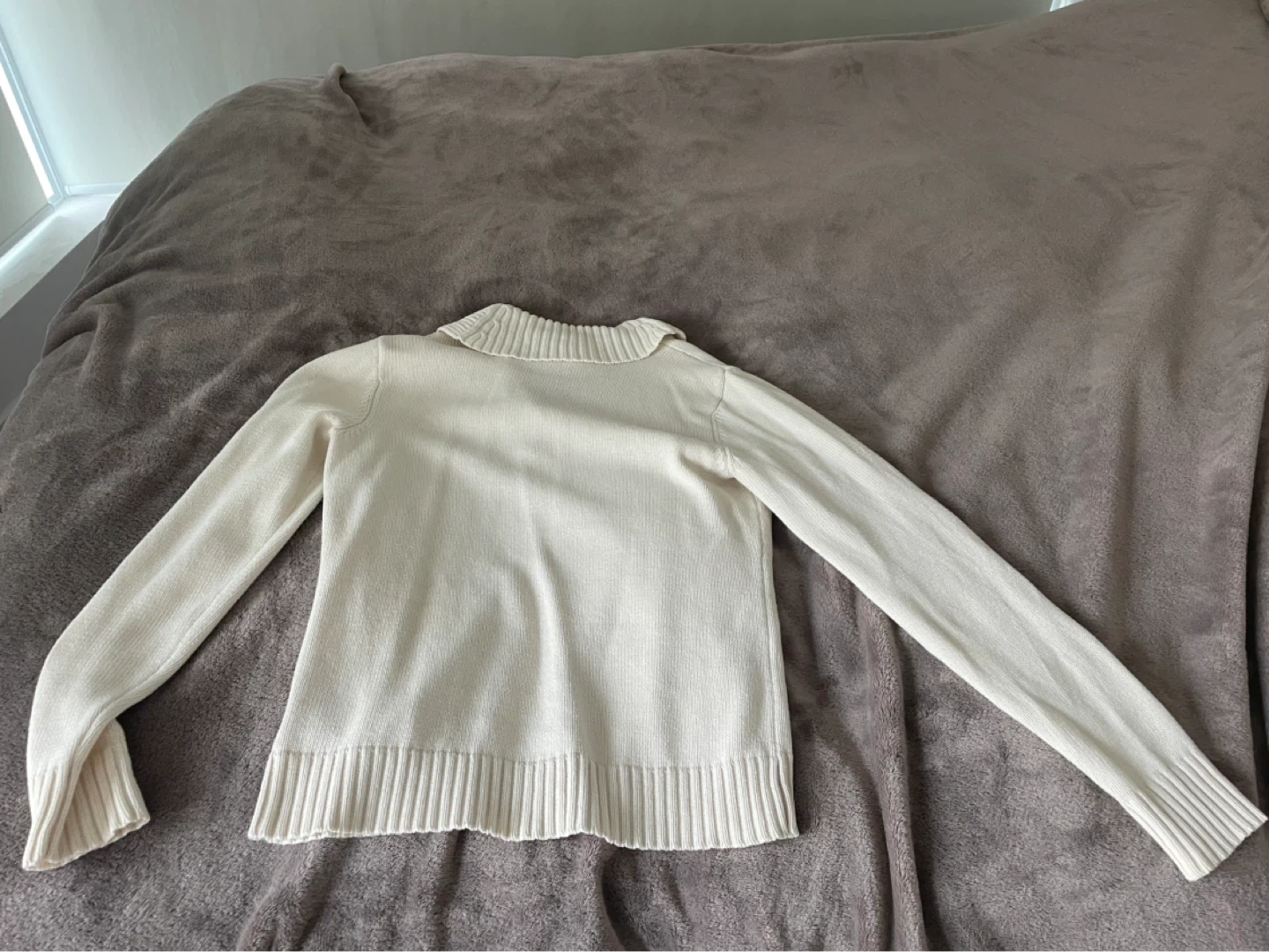 This is a cream-coloured Lauren Ralph Lauren sweater. It's a size small and made from a knit material. It has a shawl collar with a decorative leather and gold buckle closure