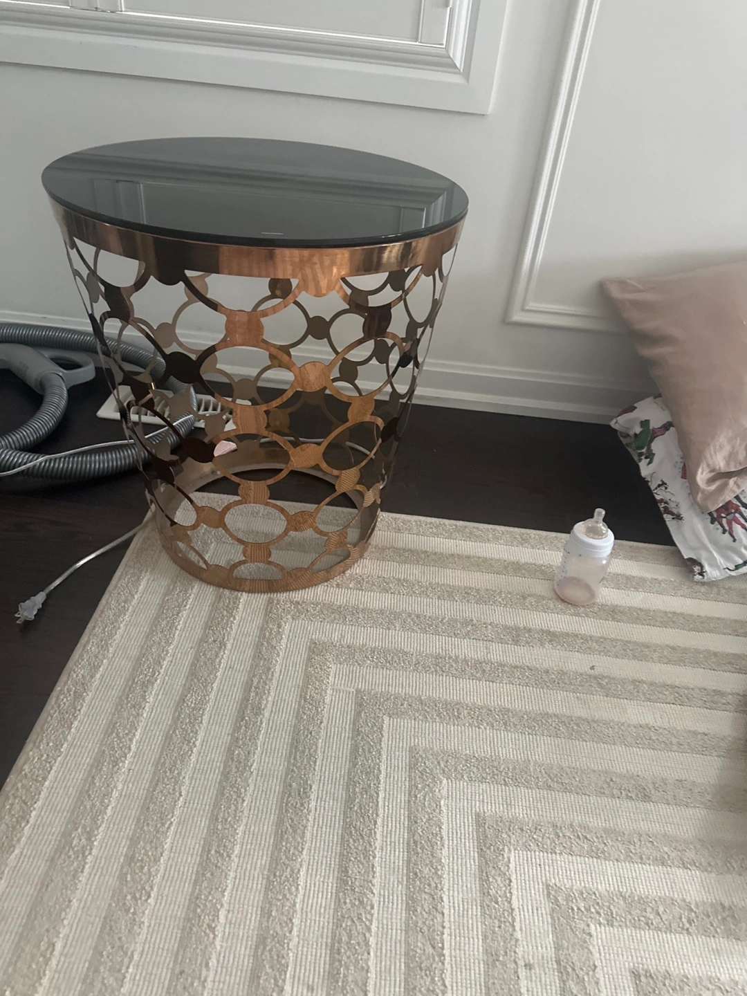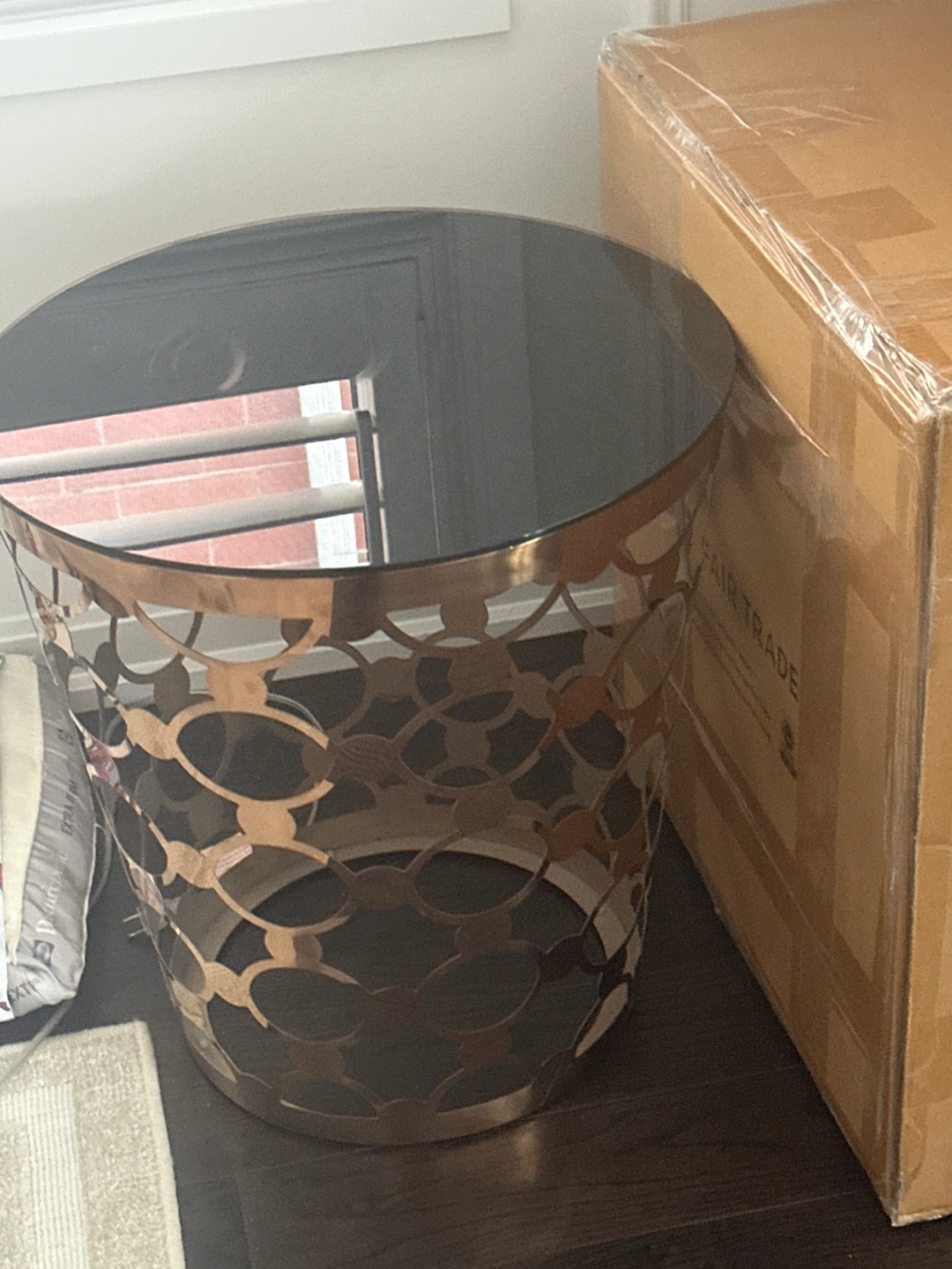 Selling a round coffee table with a glass top and a unique decorative metal base. It's in great condition and would look lovely in any living room!