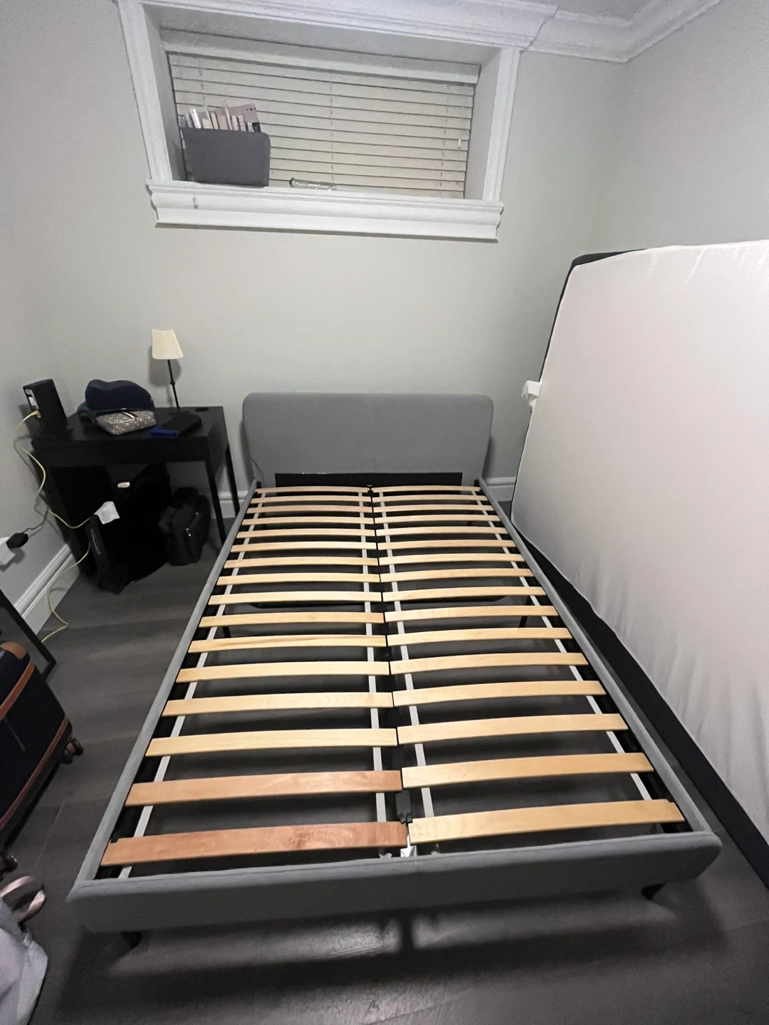 This is a IKEA Double grey fabric bed frame with a slatted base. It's designed to fit a mattress. The wooden slats provide mattress support.
