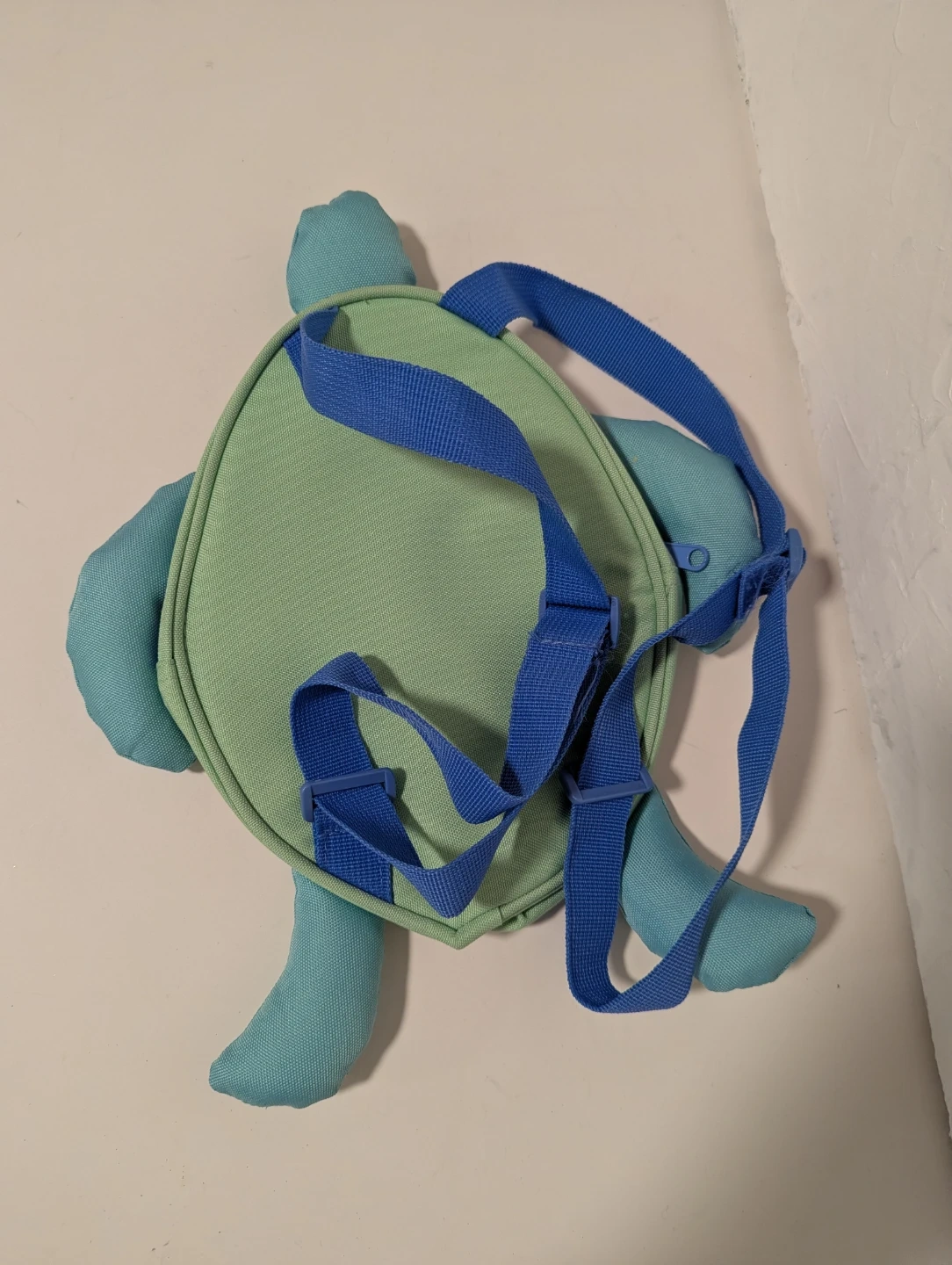 A cute turtle backpack for kids! It features a green shell with a floral design and blue straps and limbs. Perfect for carrying small items on adventures