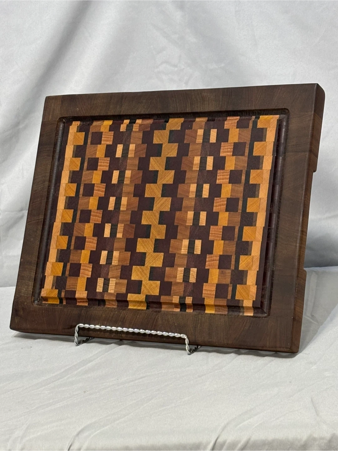 Selling a beautiful handmade end grain wooden cutting board. It features a unique checkered pattern with varying shades and multiple species of wood It would be a great addition to any kitchen!