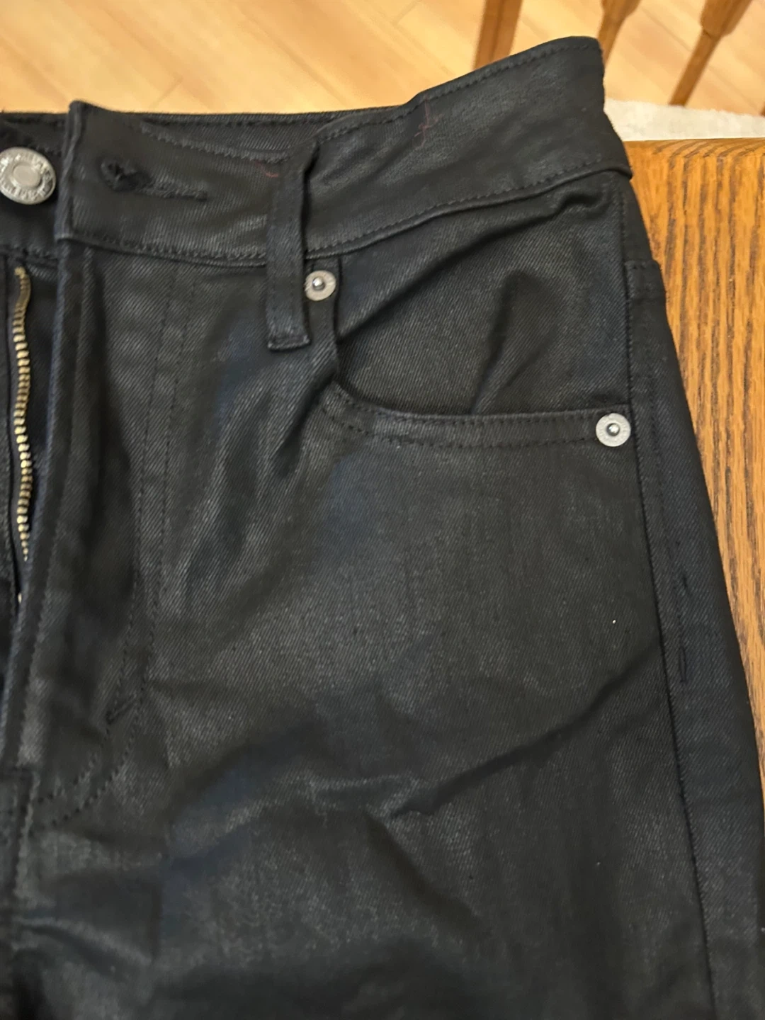 These black coated jeans have a slim fit. They're made from a durable material with a bit of stretch. The finish gives them a stylish, edgy look.