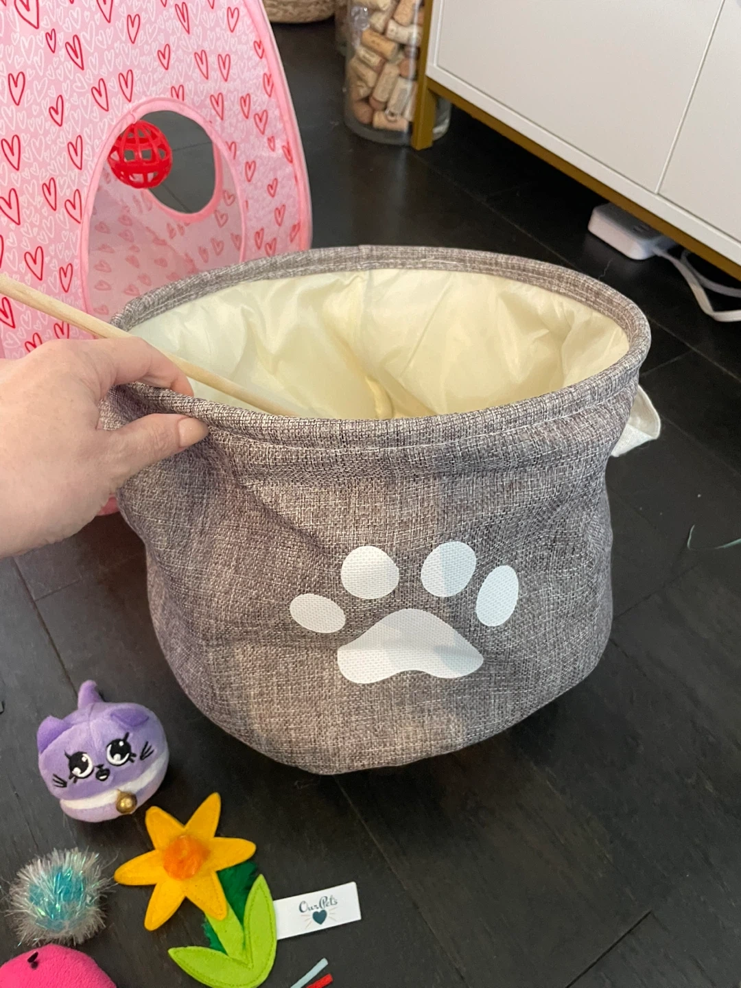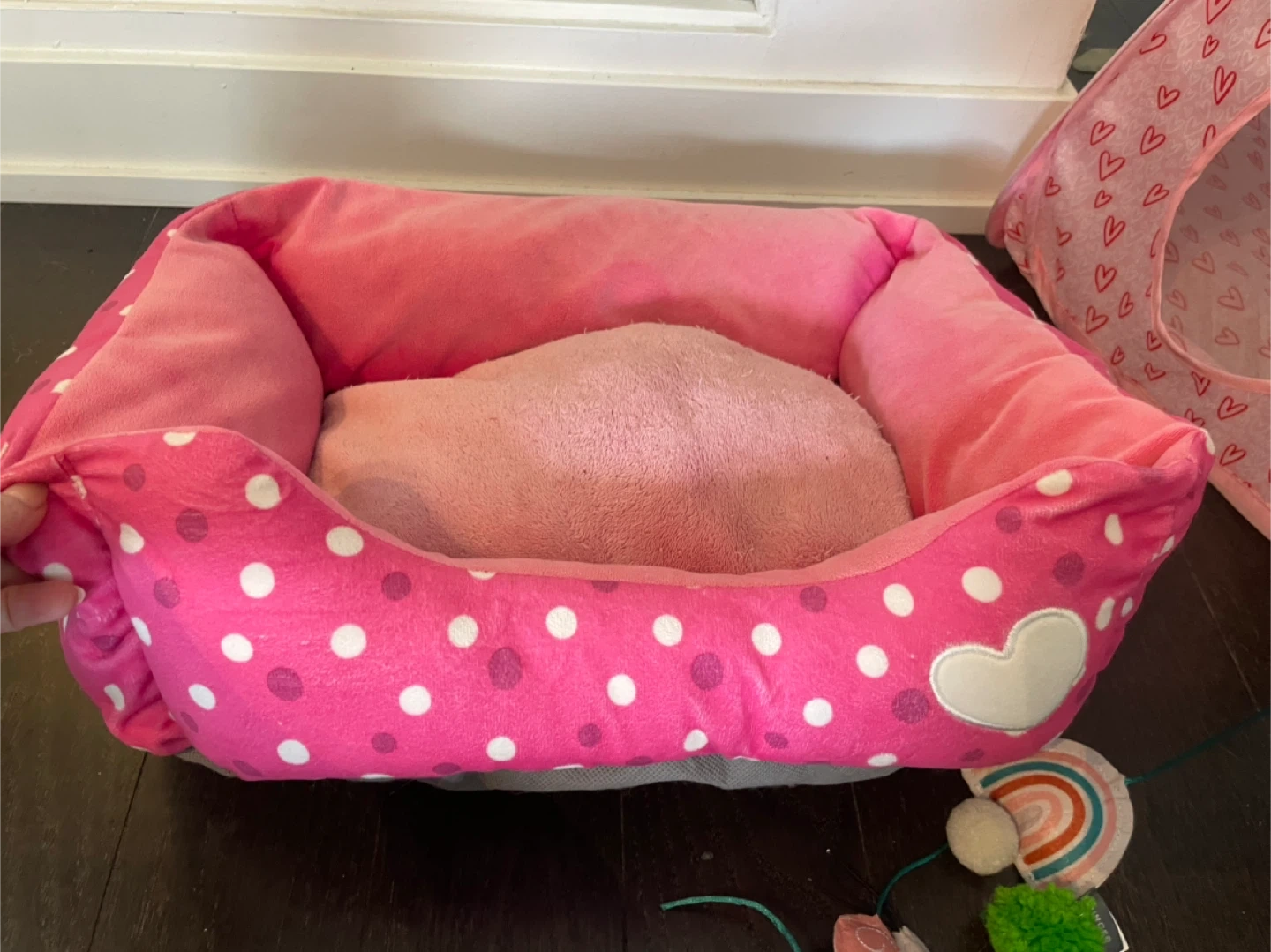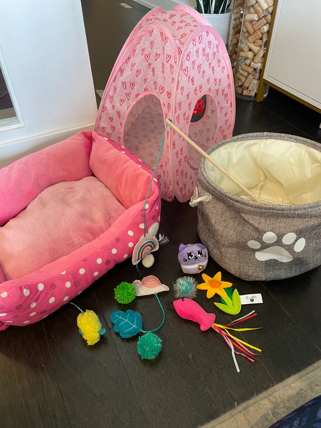 It's a fun set for your cat or kitten! Includes a pink polka dot pet bed, a heart-patterned play tent with a dangling ball, and a storage basket with a paw print design. Lots of dangly toys are also included to keep your feline friend entertained.