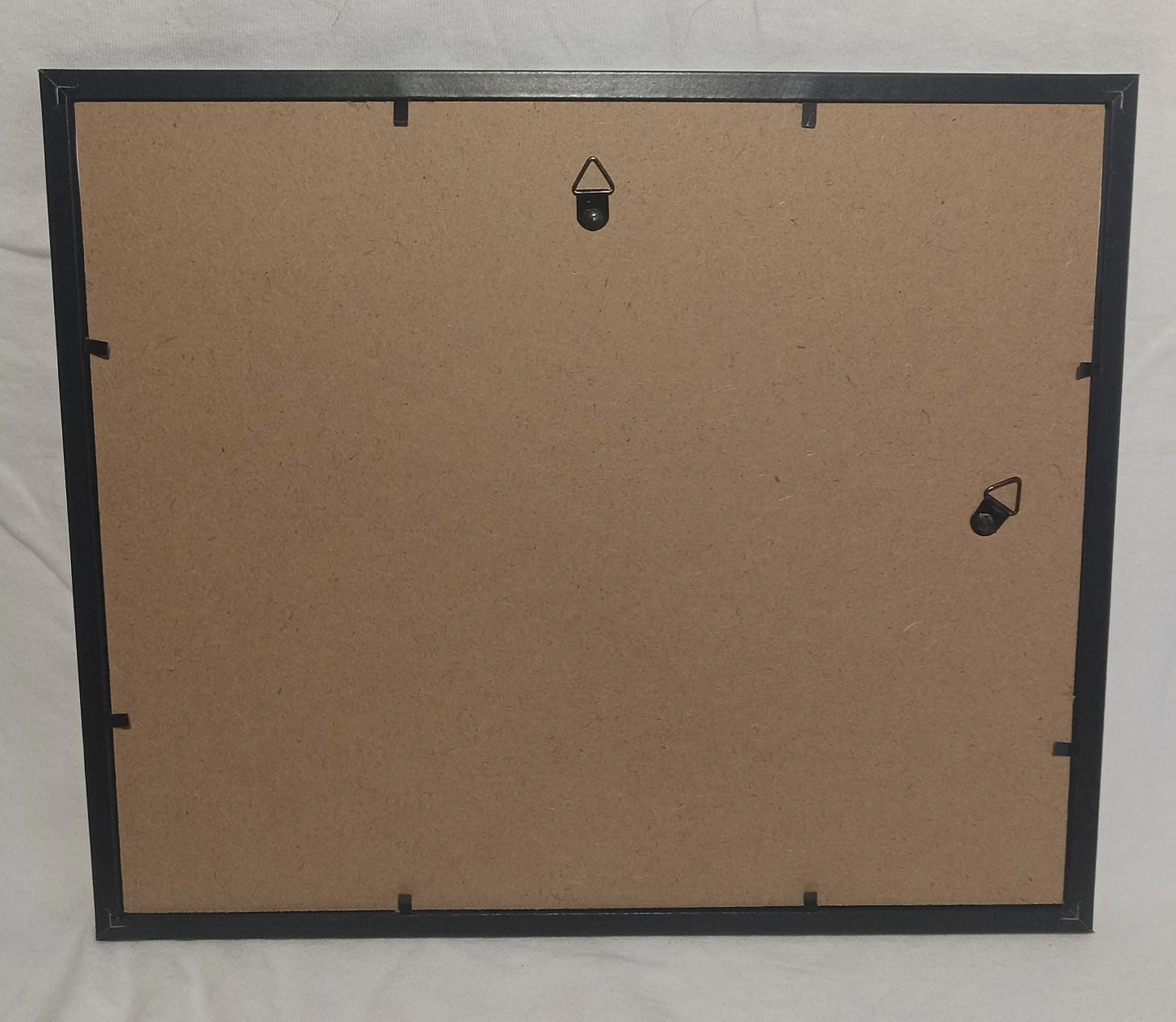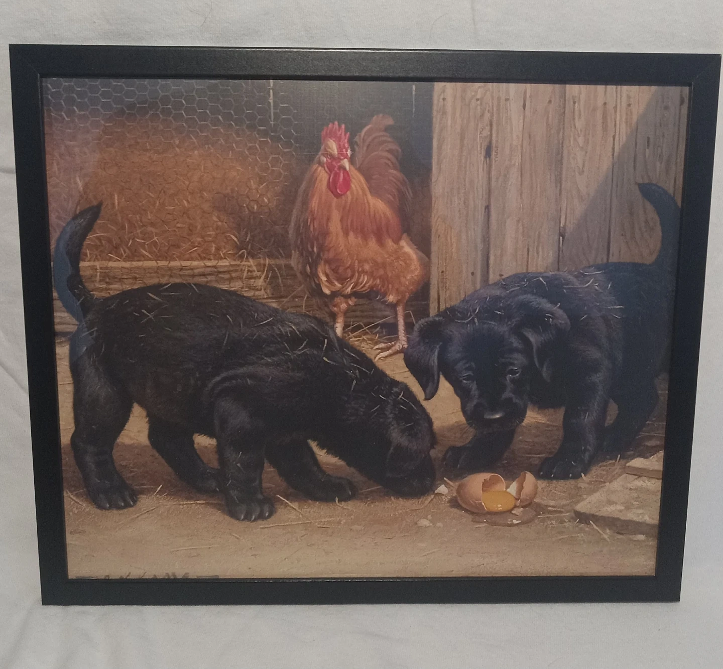 Framed art print featuring two black puppies discovering a broken egg, with a rooster in the background. Black frame with hanging hardware included. Great for a barnyard or animal-themed decor!