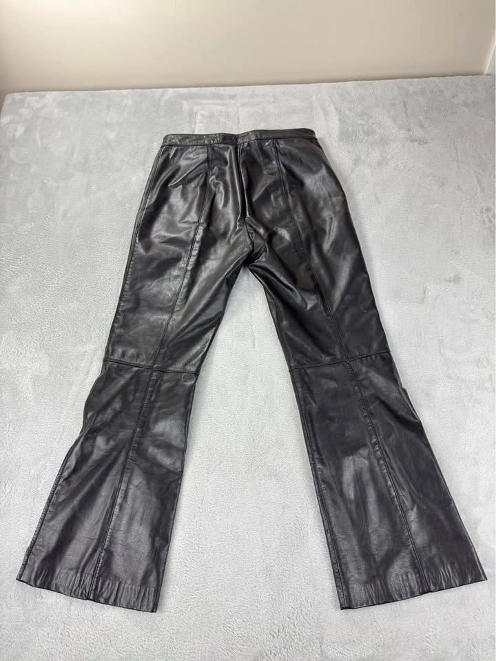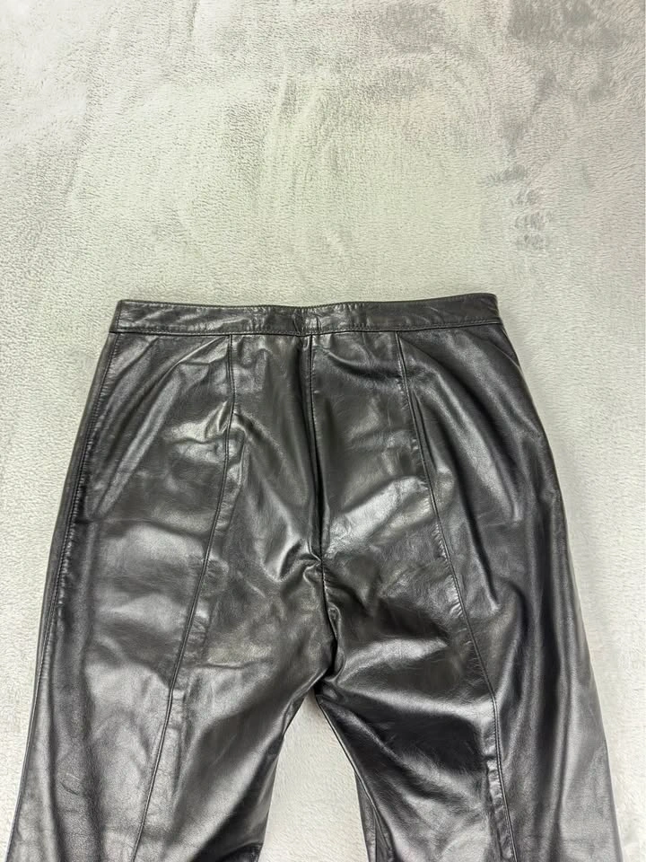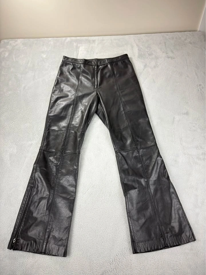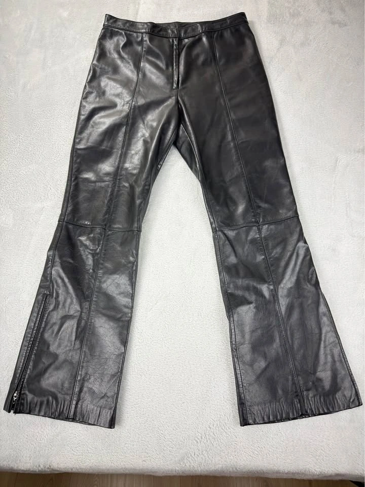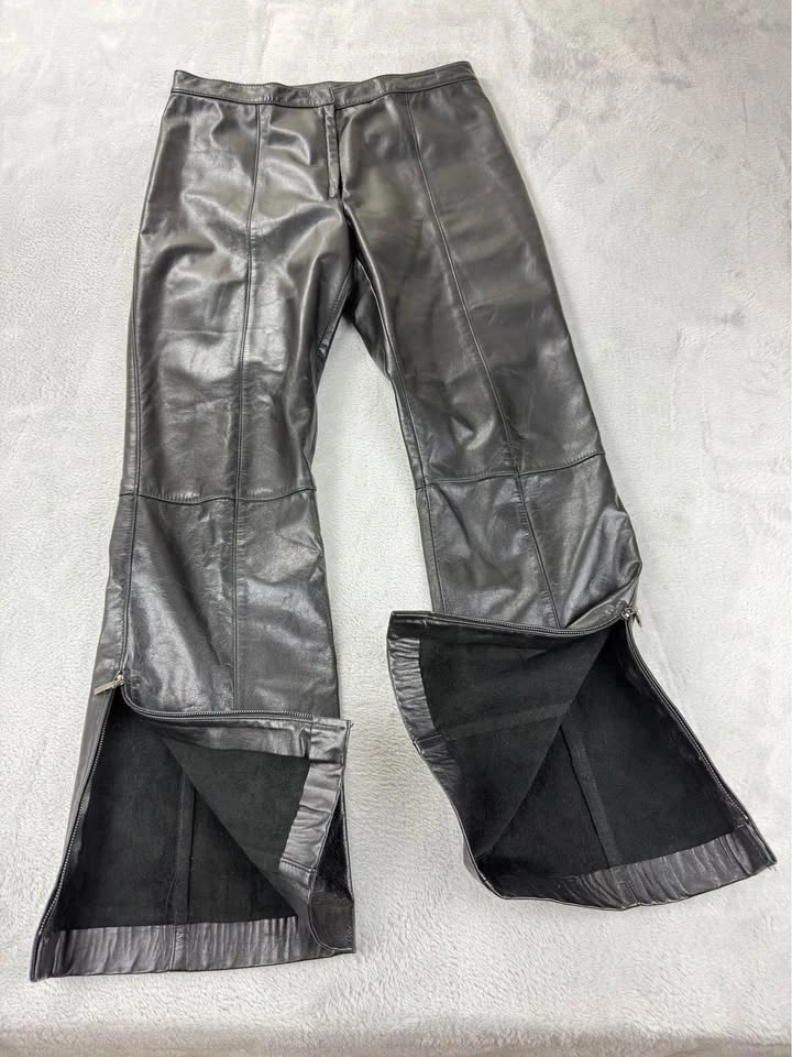 Danier Women's 100% Leather Black Pants. Made in China. Good pre-owned condition as shown in photos, no flaws. Features cool flared zippers at the bottom.