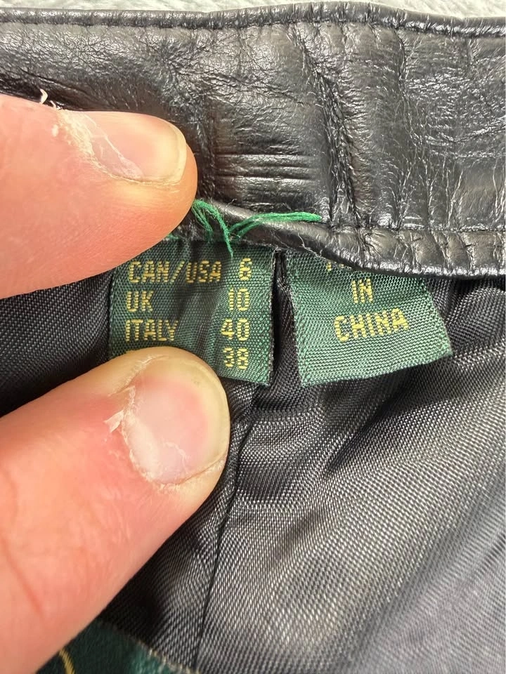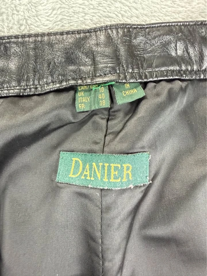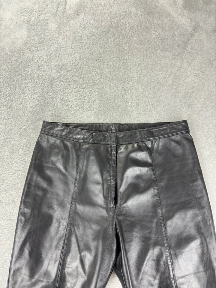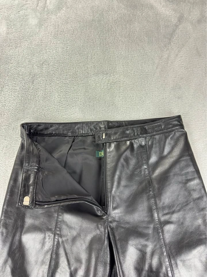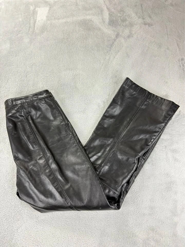Danier Women's 100% Leather Black Pants. Made in China. Good pre-owned condition as shown in photos, no flaws. Features cool flared zippers at the bottom.