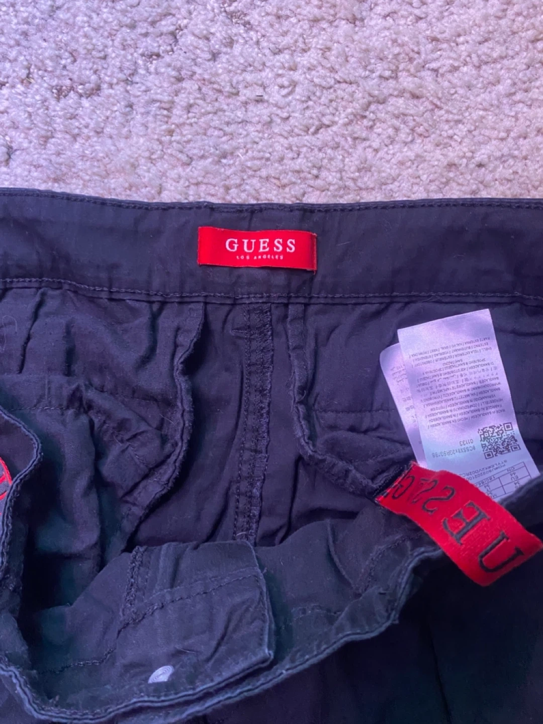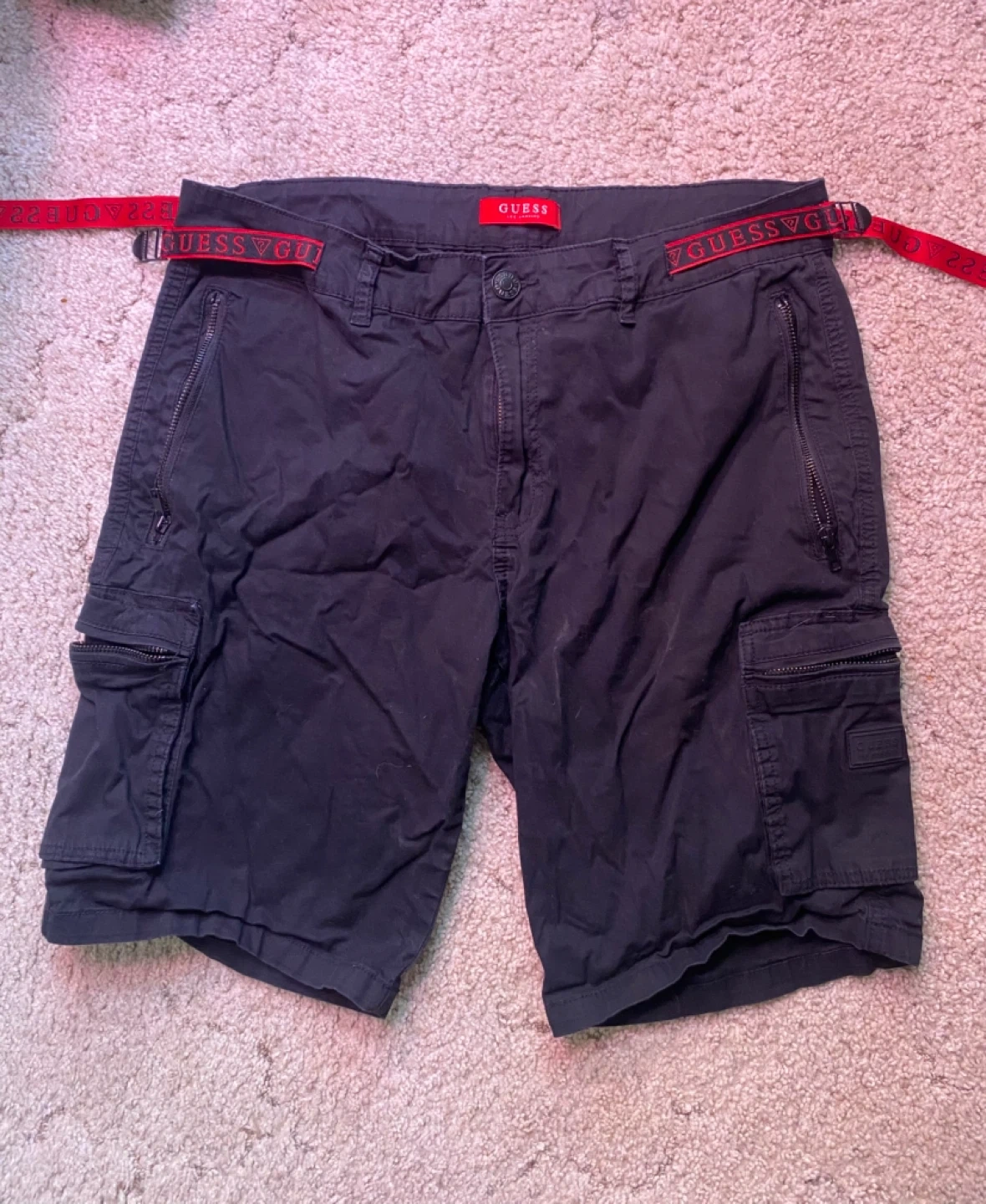 These Guess cargo shorts are black and come with a red logo belt. They feature multiple zippered pockets for secure storage. The waist size is 34.
