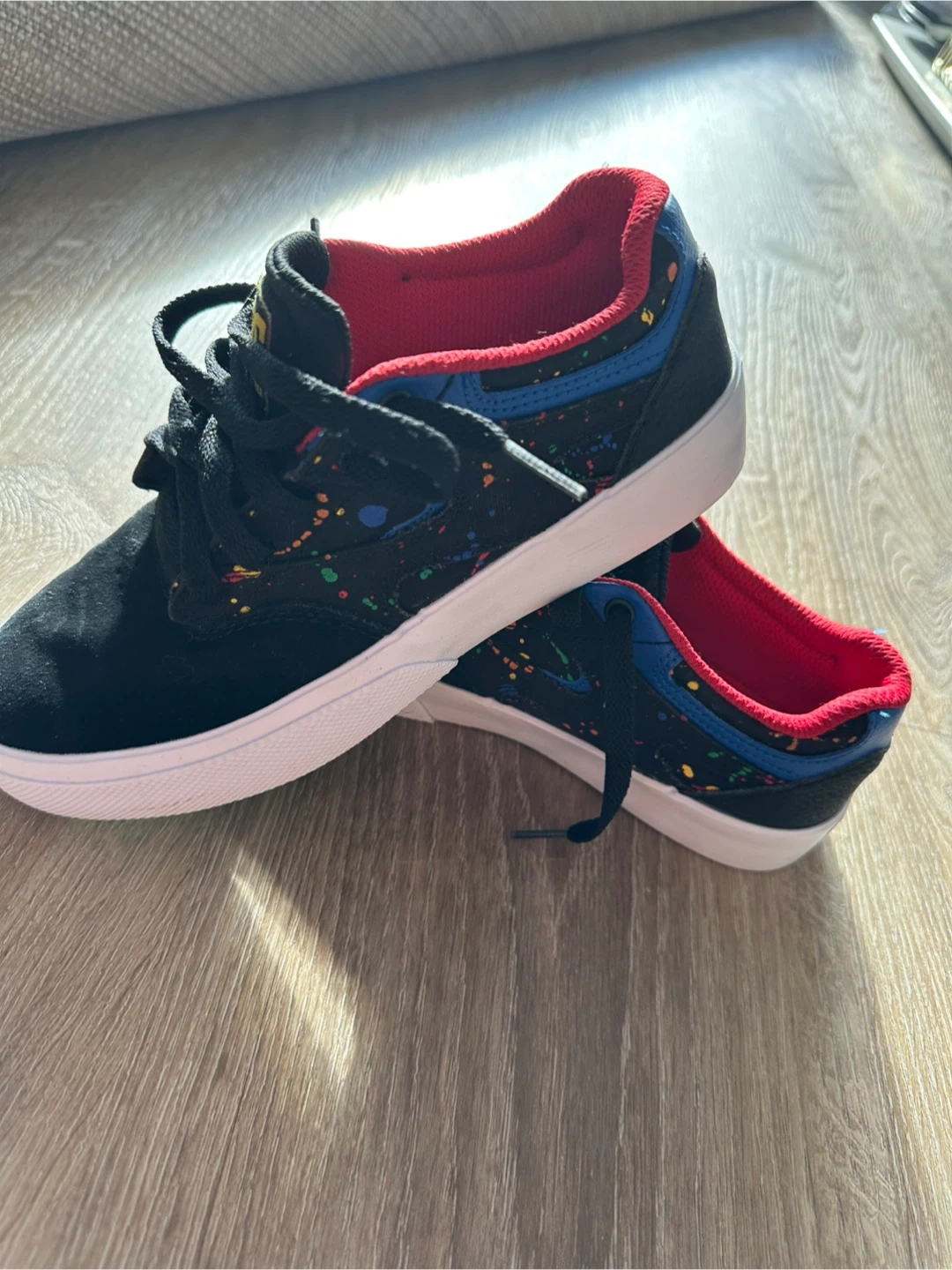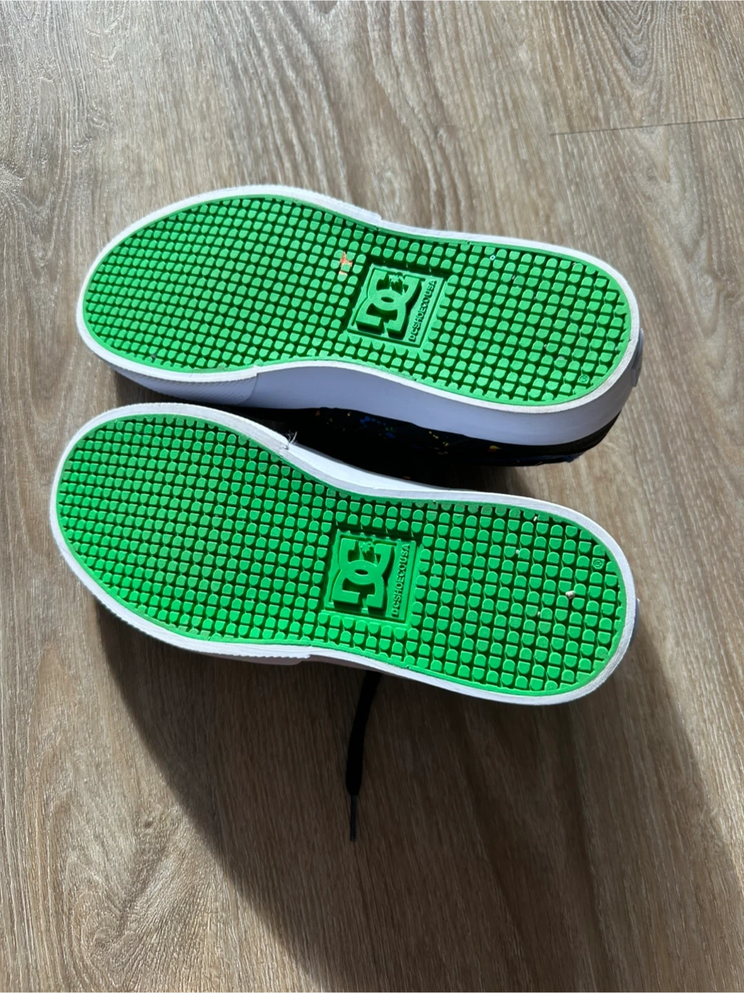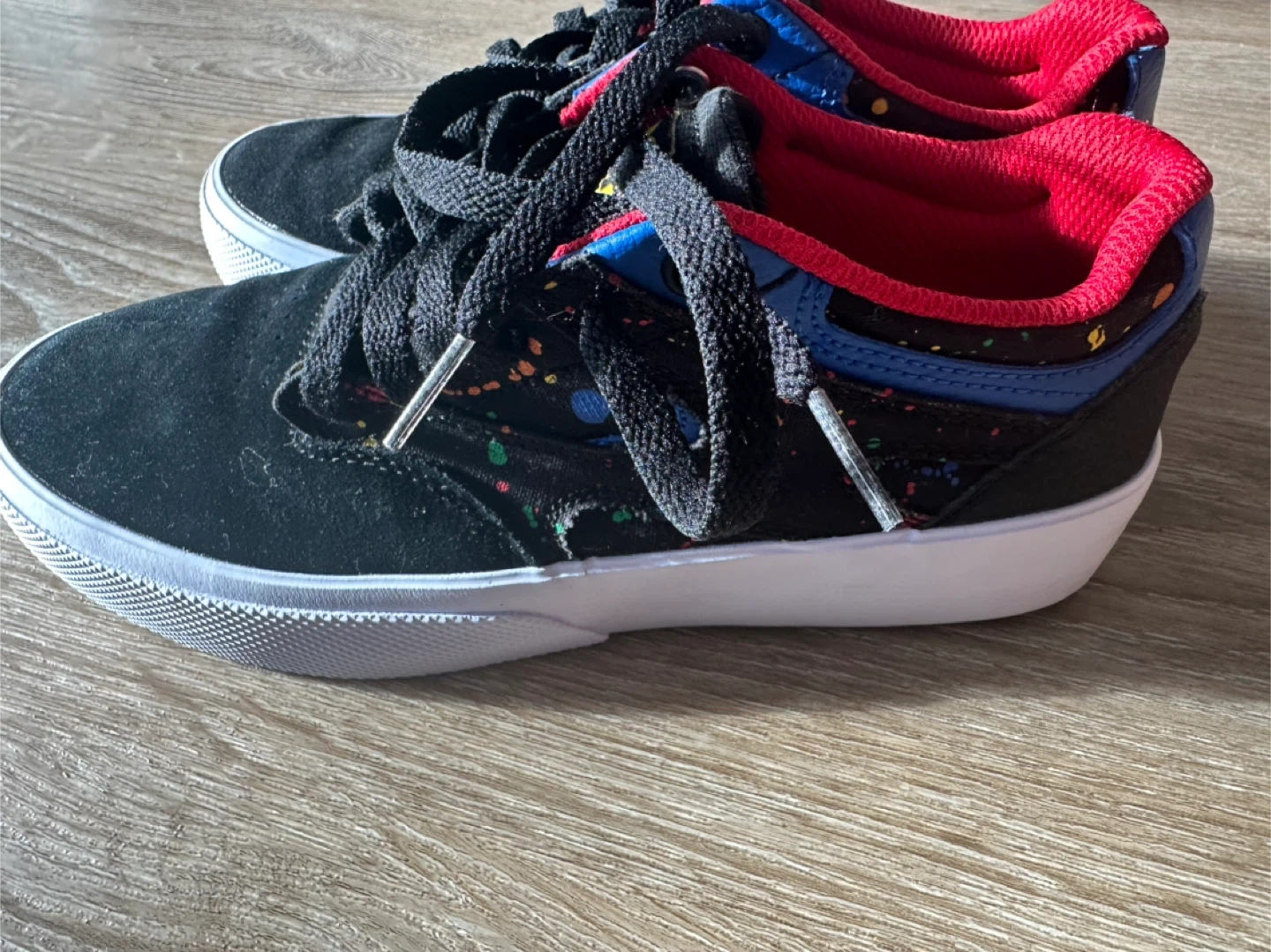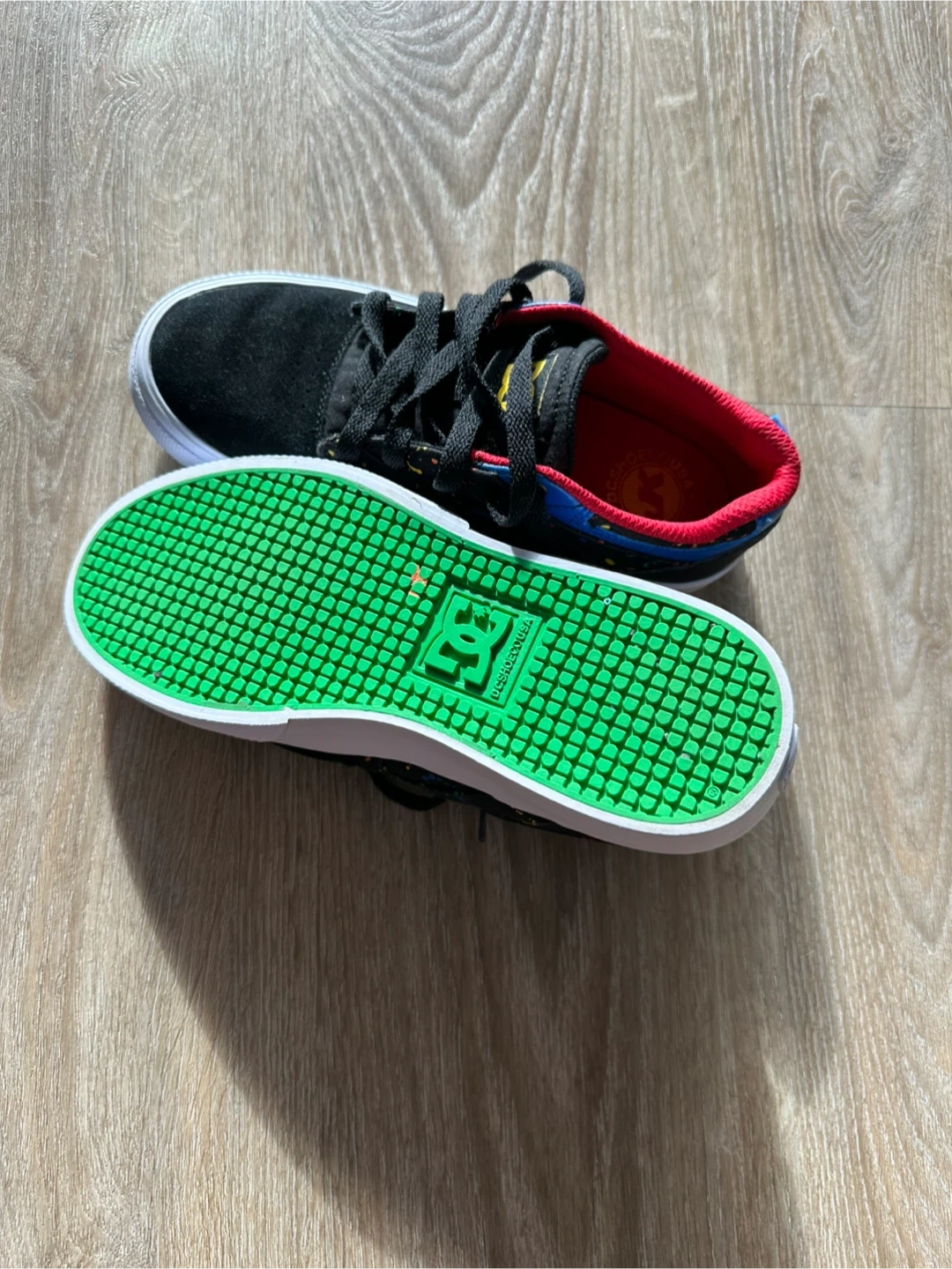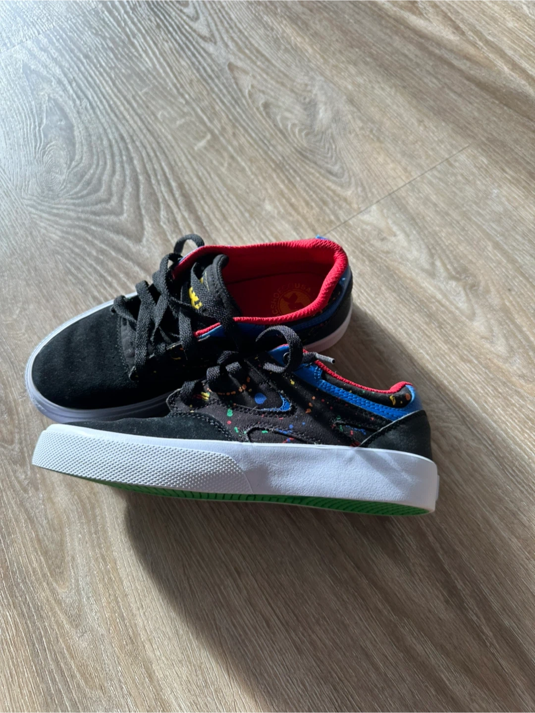 These DC shoes are black with a suede upper and a red interior lining. They feature a colourful splatter design on the side and have grippy green outsoles with the DC logo. Great for skateboarding!