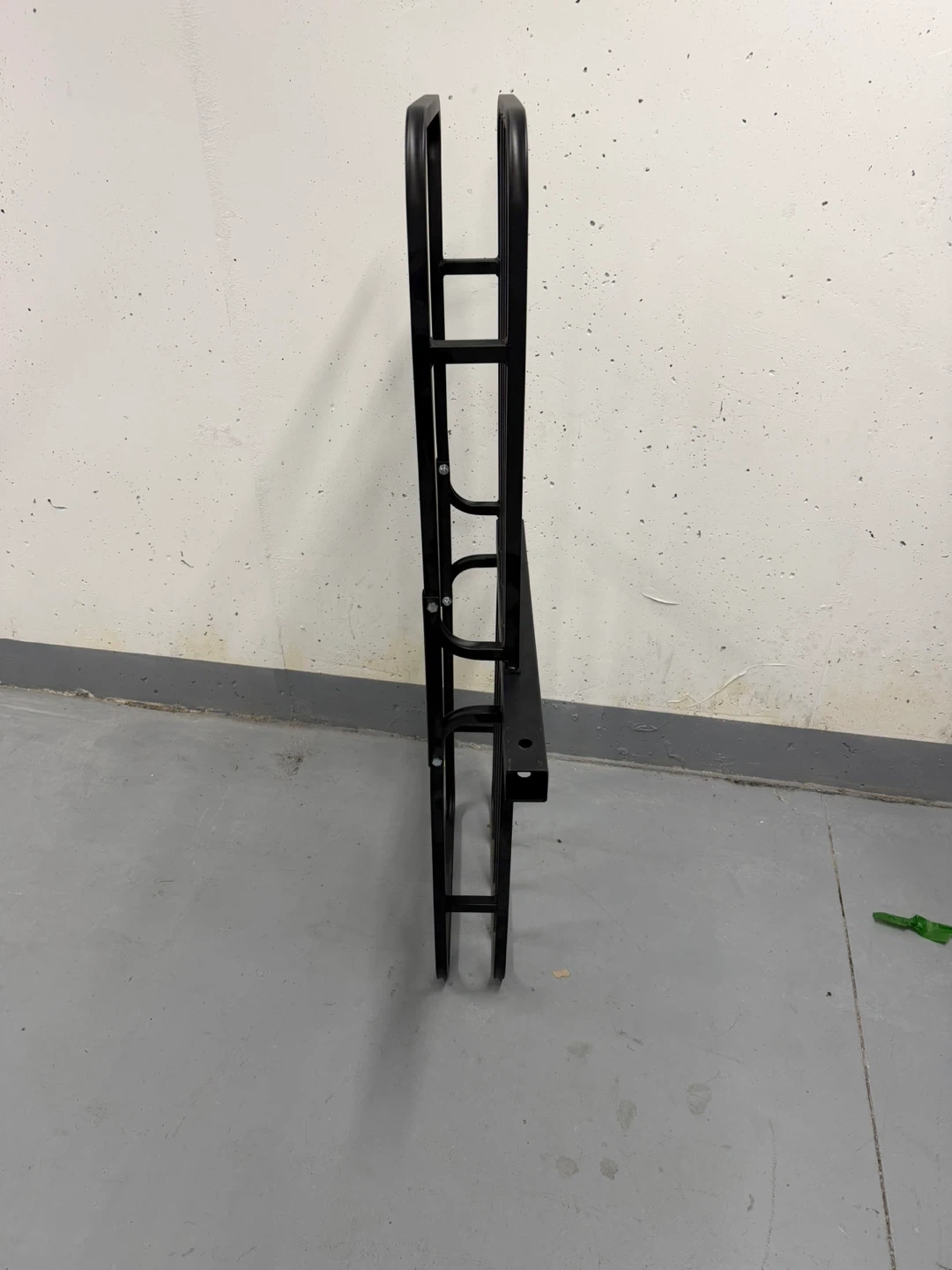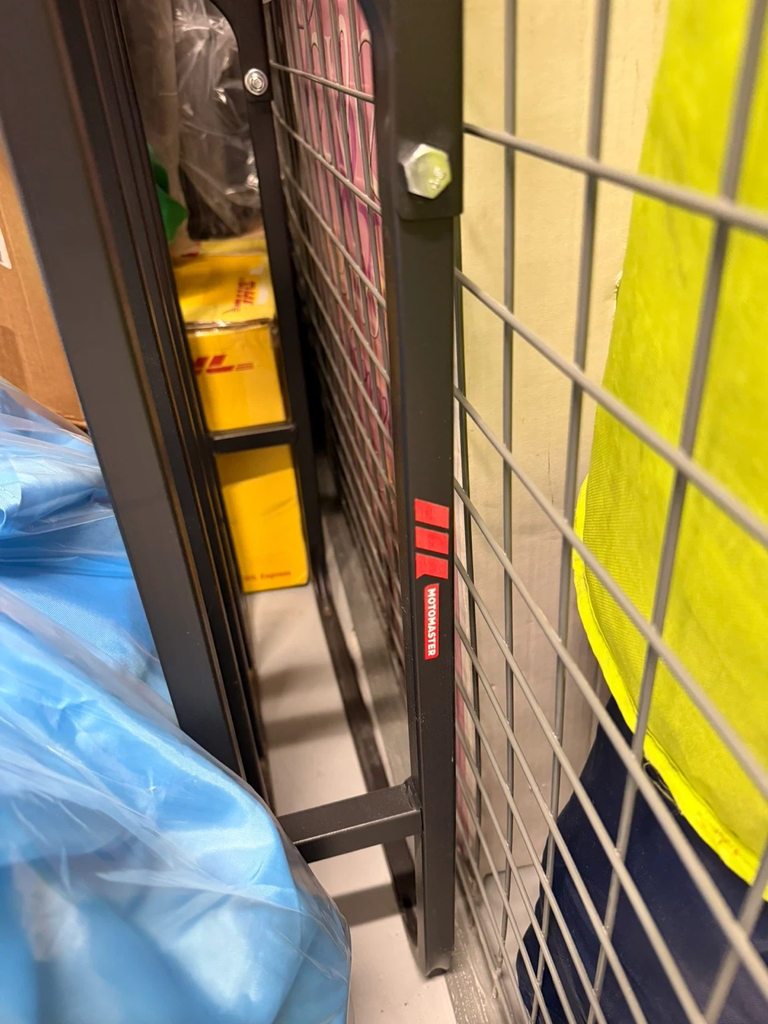 This is a Motomaster hitch mount cargo carrier. It's made of black metal. This carrier is useful for transporting extra gear on your vehicle.