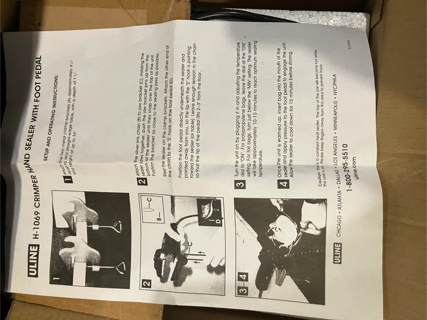 60Selling a Uline H-1069 hand sealer with foot pedal! It comes with the original box and instructions. This crimper hand sealer is great for sealing bags. Perfect for use on any straight clamp brackets with a depth of 1 1/2" and height up to 36".