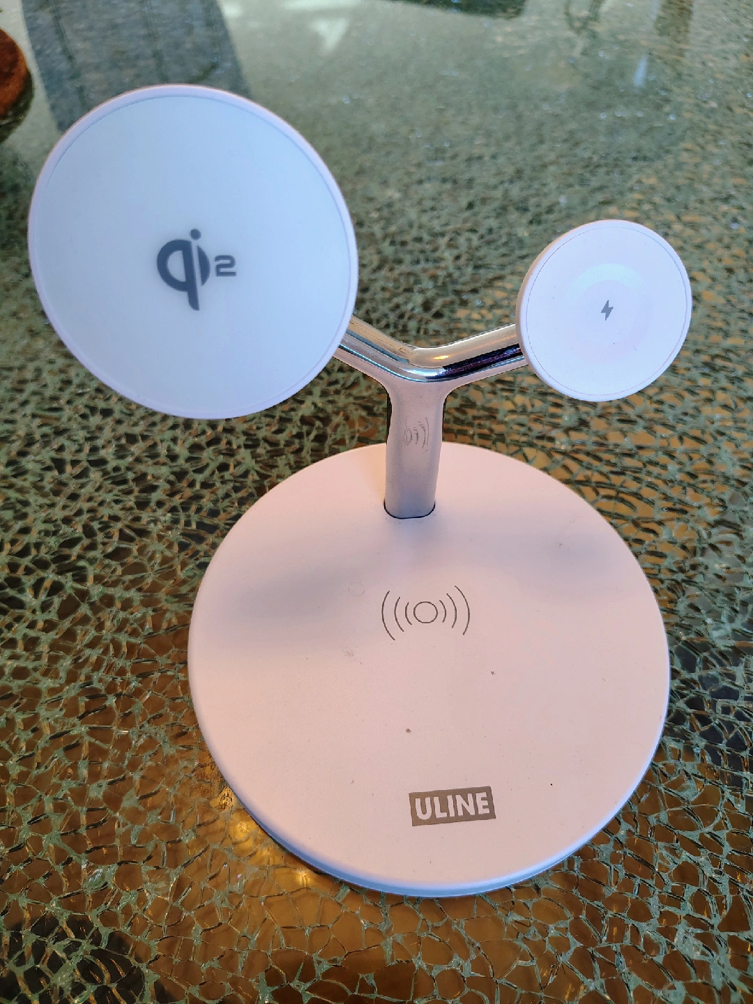 73Selling a Uline 3-in-1 wireless charging stand, model H-11501. It can charge your mobile (15W/10W/7.5W/5W), earbuds (5W), and Apple Watch (2.5W) all at once! It has a Type-C input (9V==3A) and a USB-A output (5V==1A)