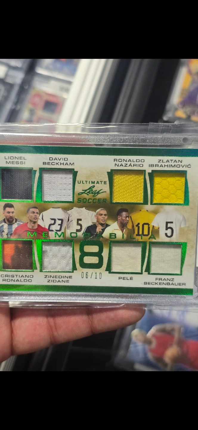 Selling an Ultimate Leaf Soccer card featuring legends like Lionel Messi, David Beckham, Ronaldo Nazário, Zlatan Ibrahimović, Cristiano Ronaldo, Zinedine Zidane, Pelé, and Franz Beckenbauer! It's numbered 06/10.