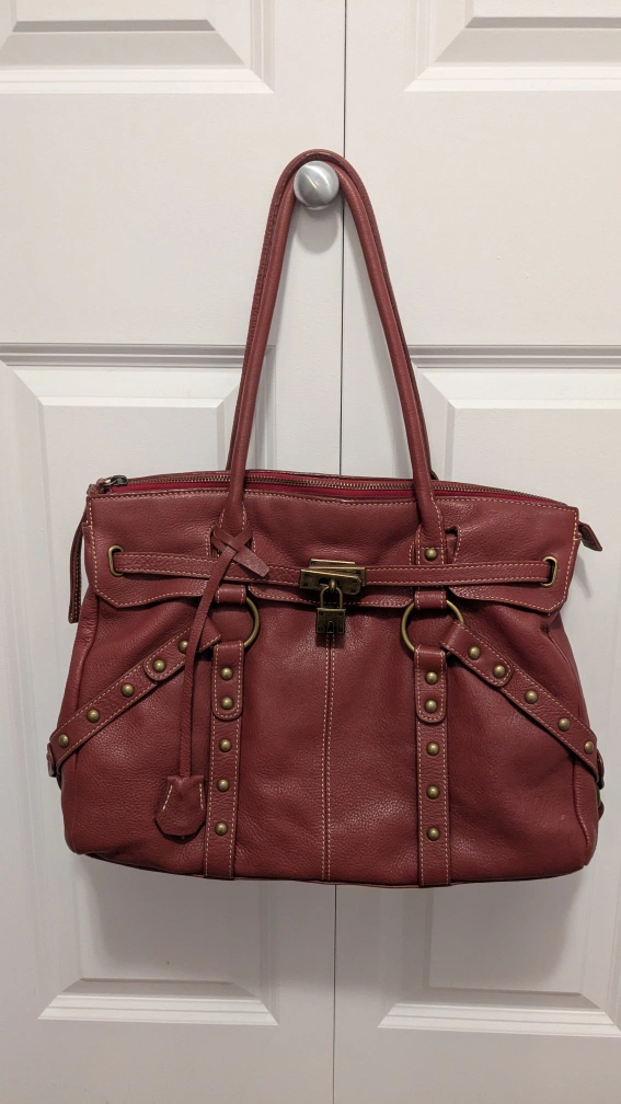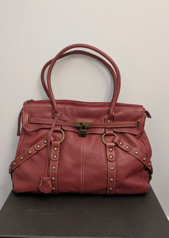 Large red leather tote bag with studded detail and comfortable straps. Has a lock on the front.
