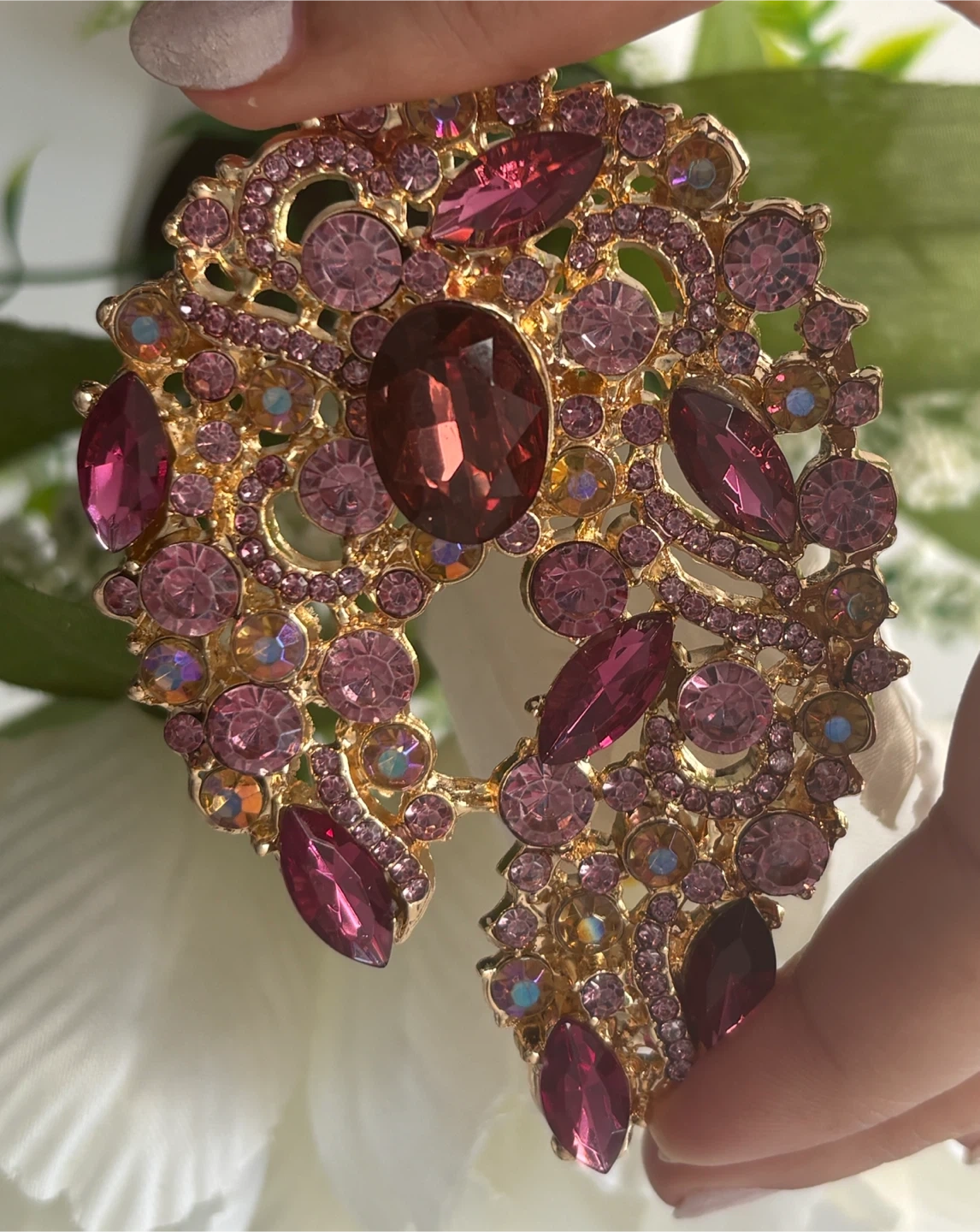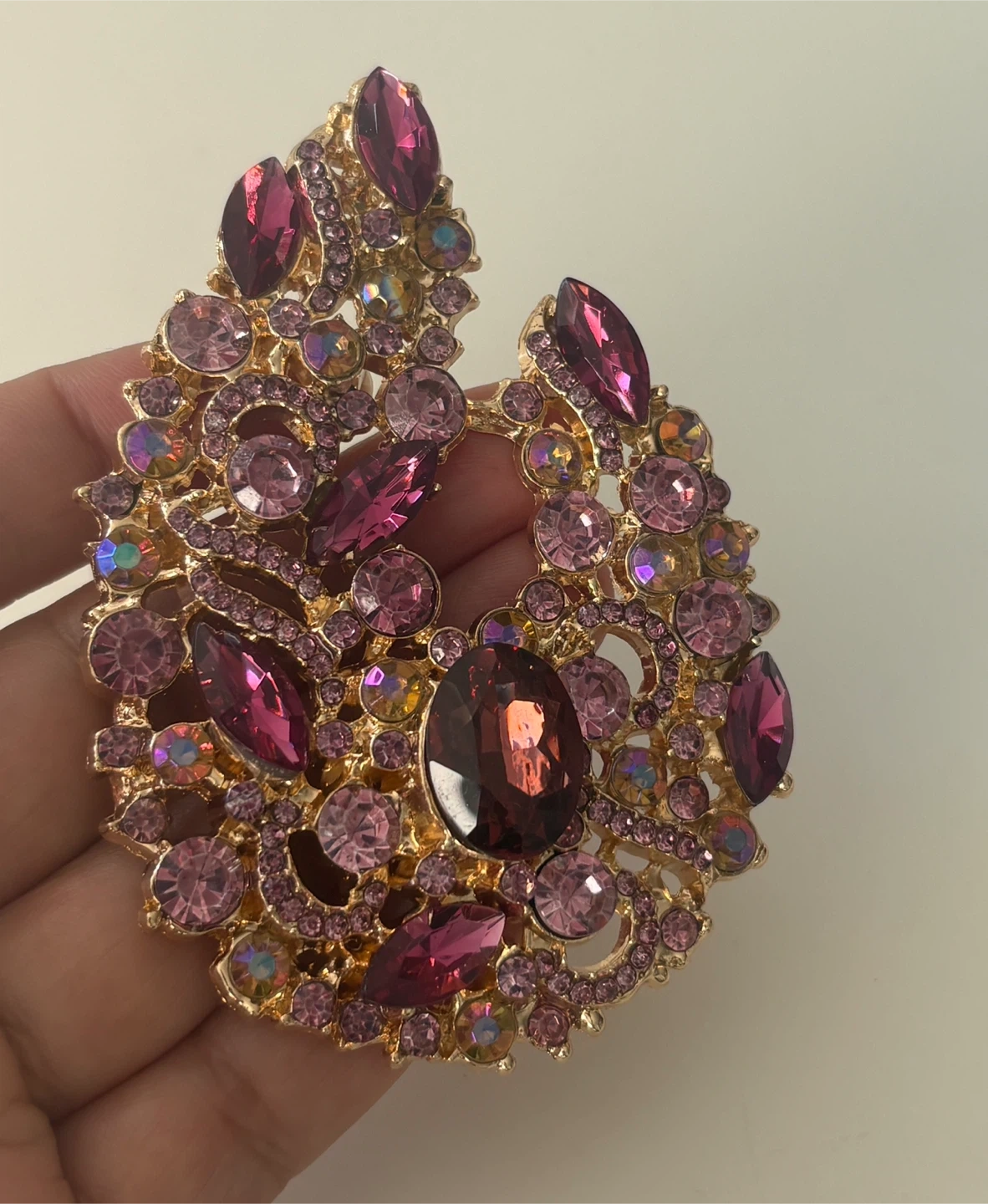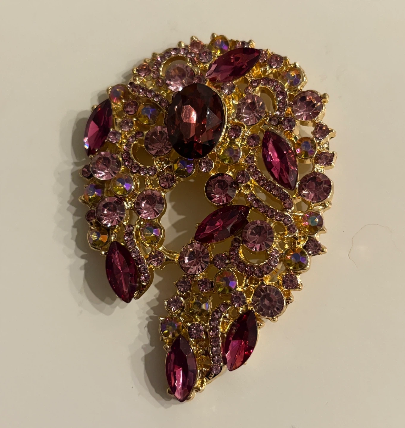 Beautiful gold-tone brooch embellished with various shades of pink and purple crystals. It features an intricate, ornate design with a mix of marquise and round-cut stones. This piece adds a touch of sparkle and elegance to any outfit!