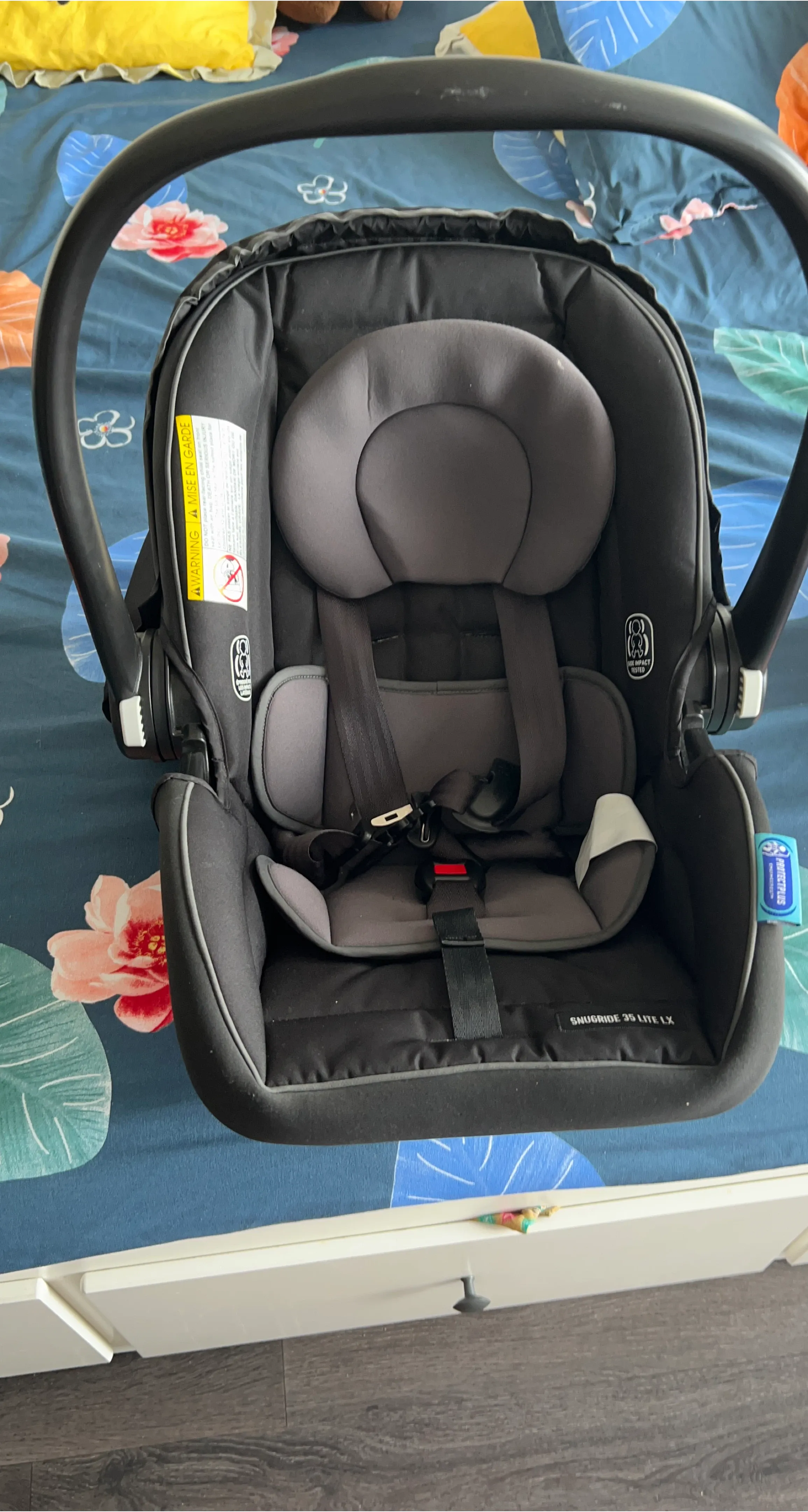 Graco SnugRide 35 Lite LX infant car seat in black and grey. Impact tested for safety. This car seat is suitable for infants and is designed for secure travel. Comes with harness and headrest.