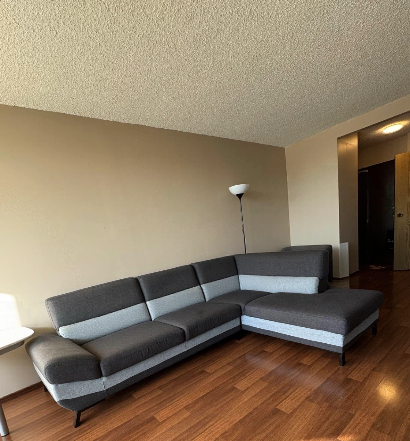 This is a two-tone sectional sofa with dark grey and light grey fabric. It's a great addition for a living room or den. Its chaise is on the right side when facing the sofa.