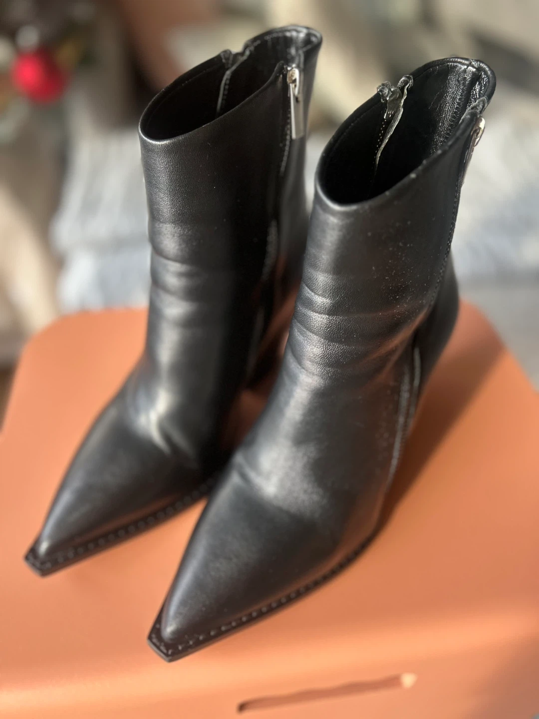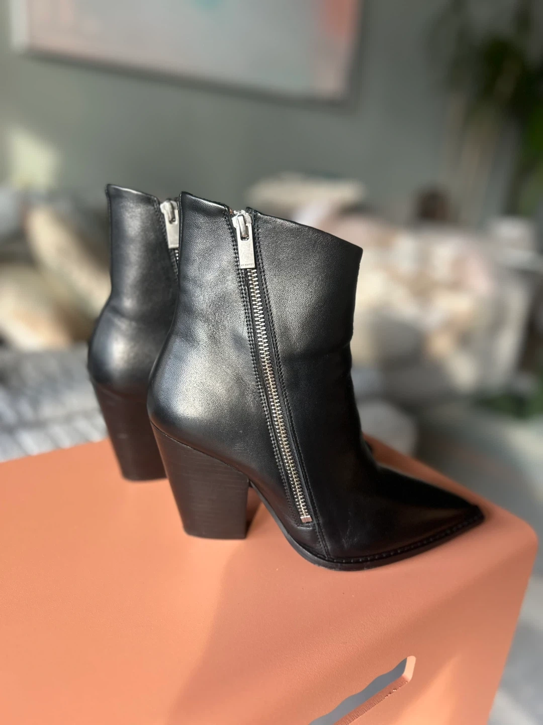 Black leather ankle boots by The Kooples Paris feature a pointed toe and a side zipper on either side of the boot. They're made of genuine leather. Worn only once.
