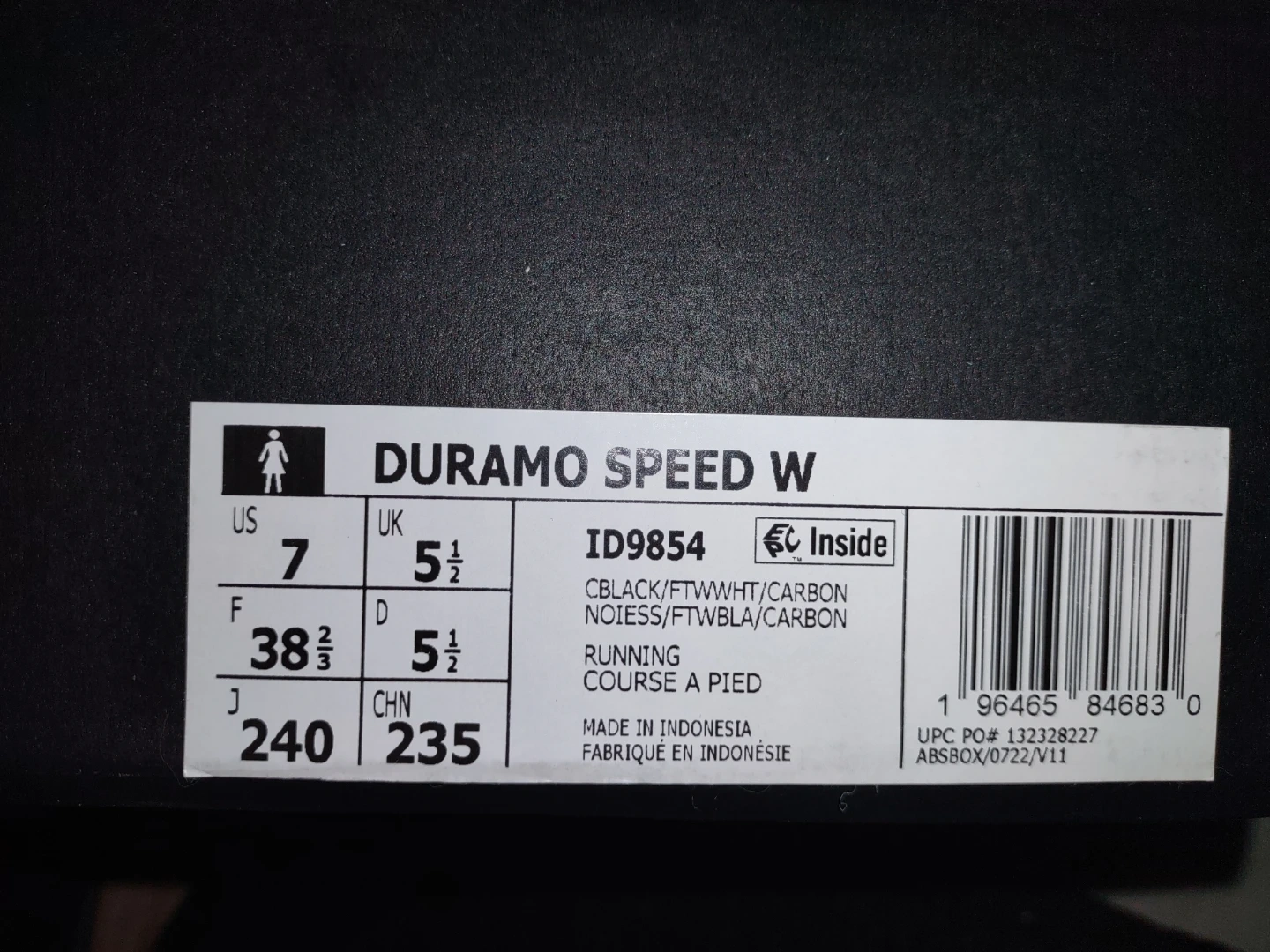 Adidas Duramo Speed W running shoes in black. They're designed for running and have a lightweight feel. The shoes are US size 7 and come with the original box.