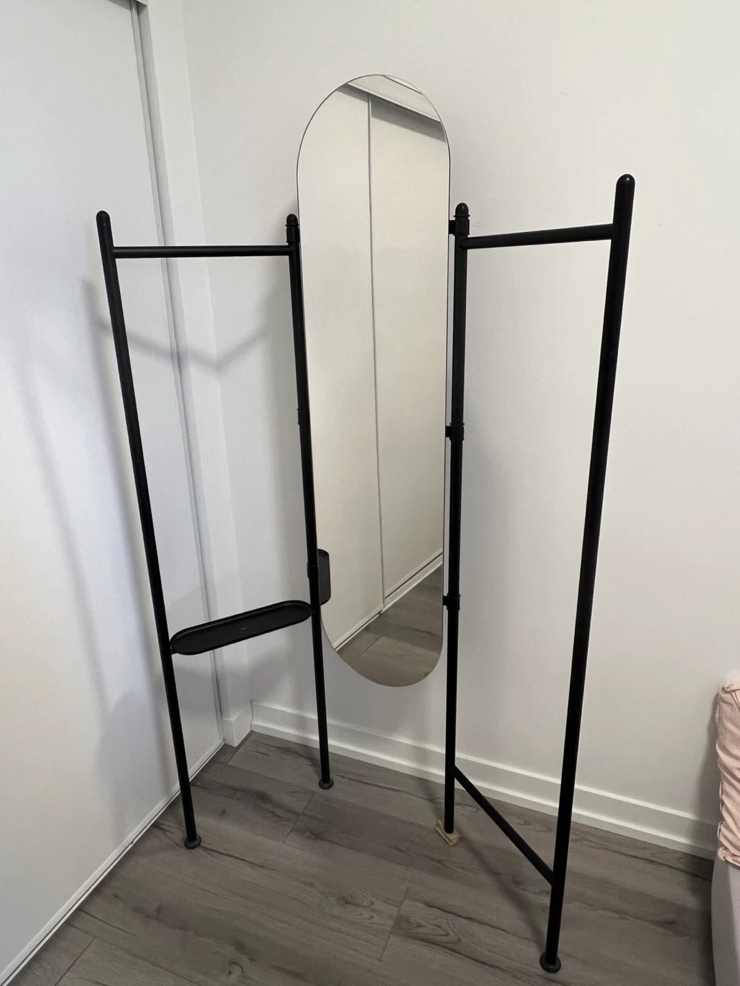 58Selling for cheap! Selling a standing mirror with a sleek black frame! It has a unique design with a built-in rack, perfect for adding a touch of style and functionality to any room in your home. There’s also a small jewelry tray. One of the leg protectors is missing, you could you a thick piece of paper to substitute it, if you want!