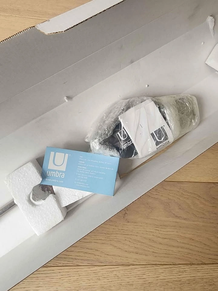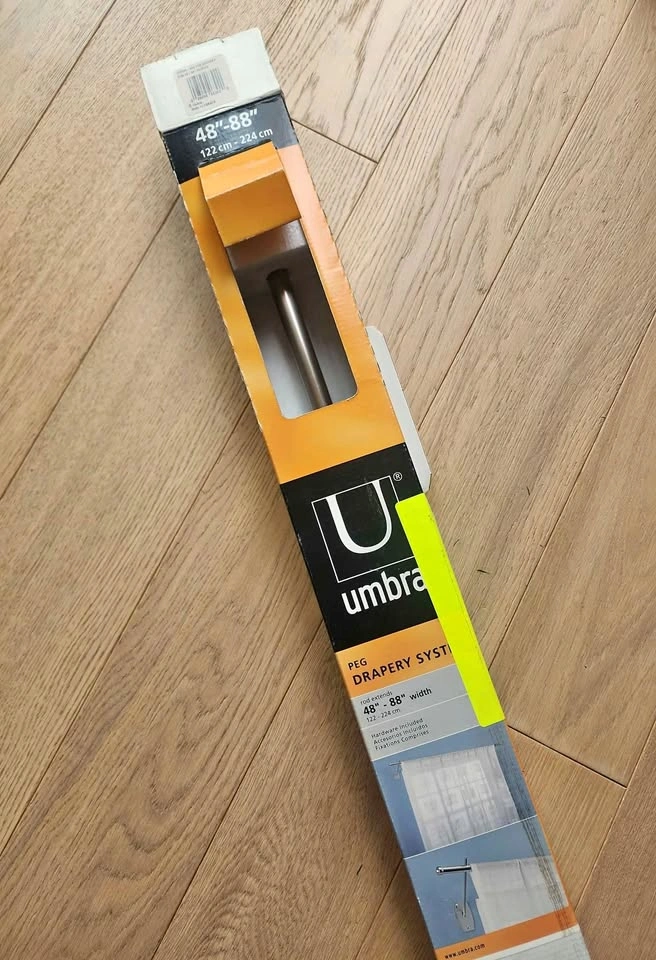 Silver, metal Umbra curtain rod with delicate final. Very sleek. All screws, wall mounts and instructions included. Length: 48" - 88" Diametre: 3/4" New in box. Never used. Pick up in Oshawa - Wilson & Taunton area. Cash only.