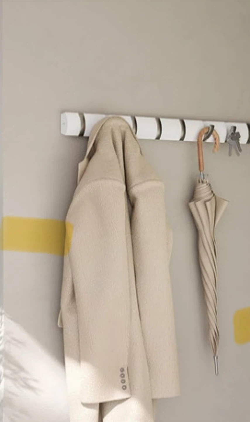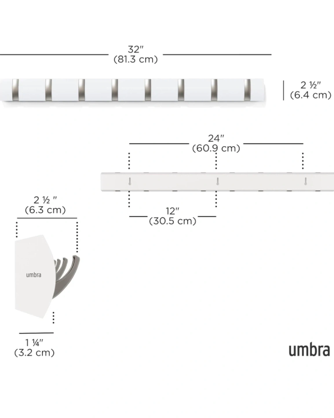 243Keep your space tidy with this Umbra Flip 8-Hook Coat Rack! It's a stylish and functional way to hang your coats, hats, and bags. The rack measures 32 inches (81.3 cm) in length and 2.5 inches (6.4 cm) in depth, with each hook extending 2.5 inches (6.3 cm) from the base. Perfect for entryways, bedrooms, or any room needing extra organization