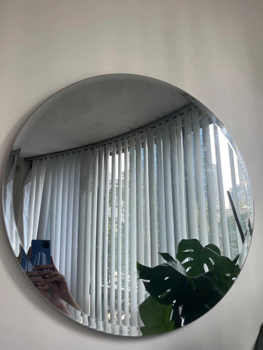 33Selling a round wall mirror. It's in great condition and ready to brighten up any space in your home Currently wall mounted by 3M Velcro but it also comes with hanging wire.