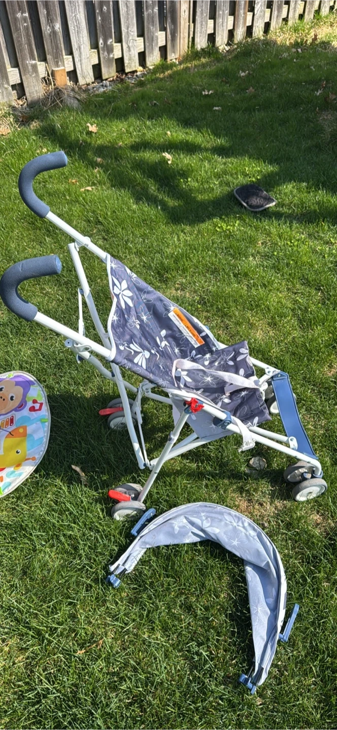 Selling a lightweight umbrella stroller with a blue and white floral pattern! It's in good condition and perfect for quick trips around town or travelling. The stroller includes a sun canopy to keep your little one shaded on sunny days. Easy to fold and store, making it a convenient option for parents on the go