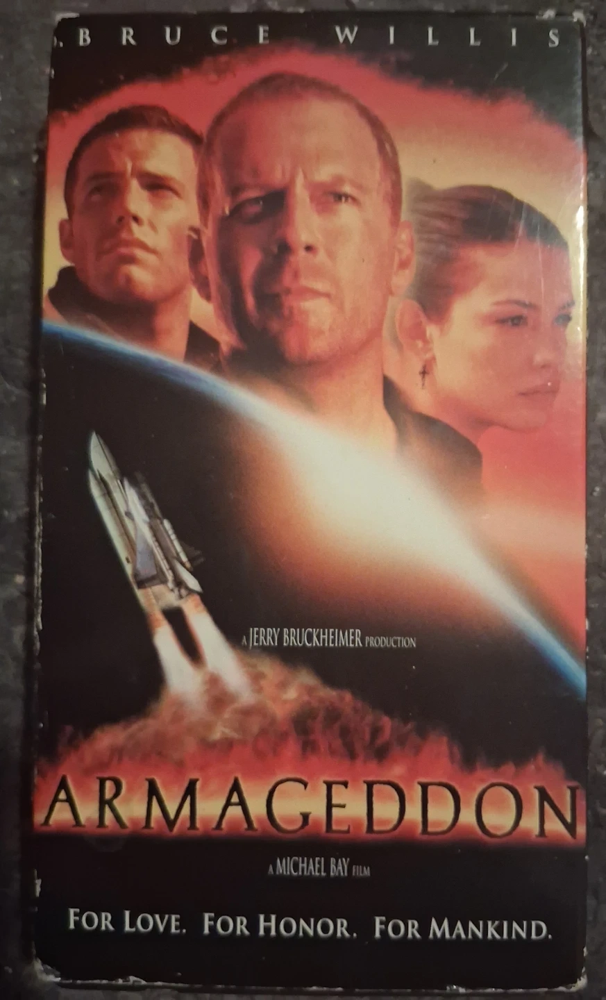 This is the VHS tape for the movie Armageddon. It stars Bruce Willis and was directed by Michael Bay. Pickup only unless near intersection of Oxford and Gammage Street.