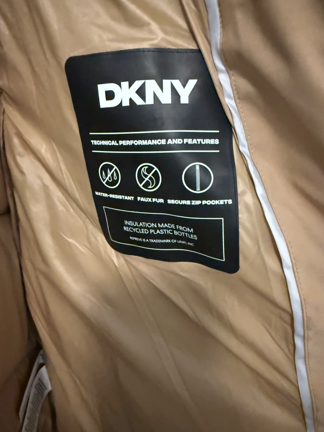 Cozy DKNY puffer coat in a lovely beige colour. It's a size medium and features a stylish belt detail. Perfect for staying warm during the colder months! Never used, it doesn’t have a tag on it. Got it as a gift