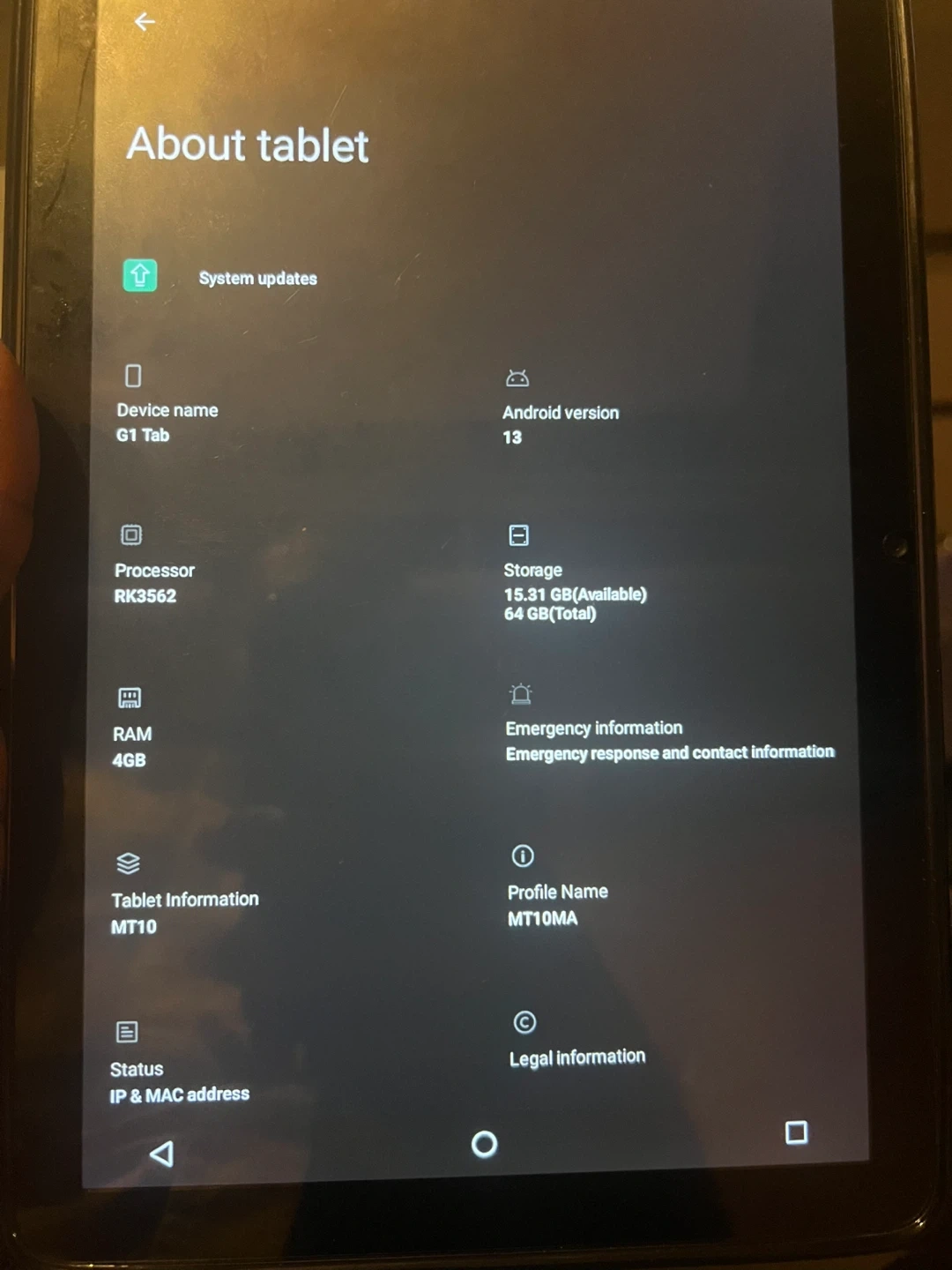 60Selling a UMIDIGI G1 Tab tablet with 64GB of total storage and 4GB of RAM. It's running Android version 13. The device name is G1 Tab and the model is MT10MA.