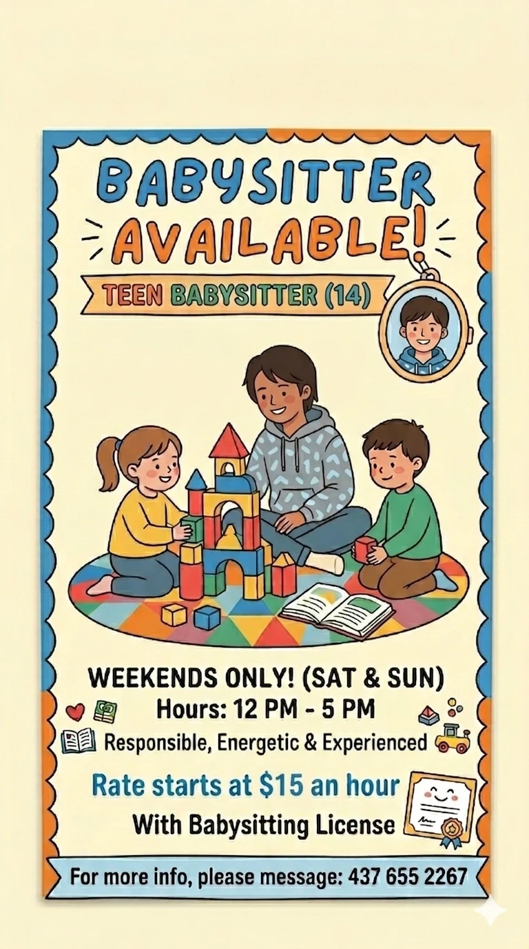 Experienced teen babysitter (14) available. Available weekends (Sat & Sun) from 12 PM to 5 PM. Rate starts at $15 an hour with a certified babysitting license. Need help watching the kids on the weekend? Message at 4376552267 for more details.