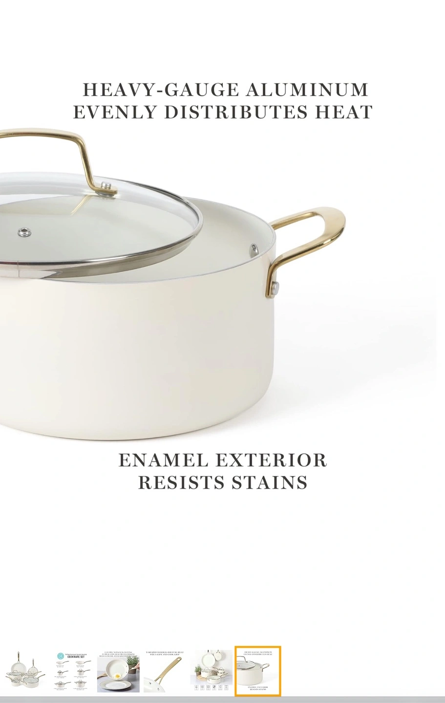 The set is gas, electric, and halogen safe, as well as oven safe up to 480°F (249°C) and dishwasher safe! The heavy-gauge aluminum evenly distributes heat, and the enamel exterior resists stains. The ceramic nonstick coating is ideal for healthier cooking with less oil and easy food release
