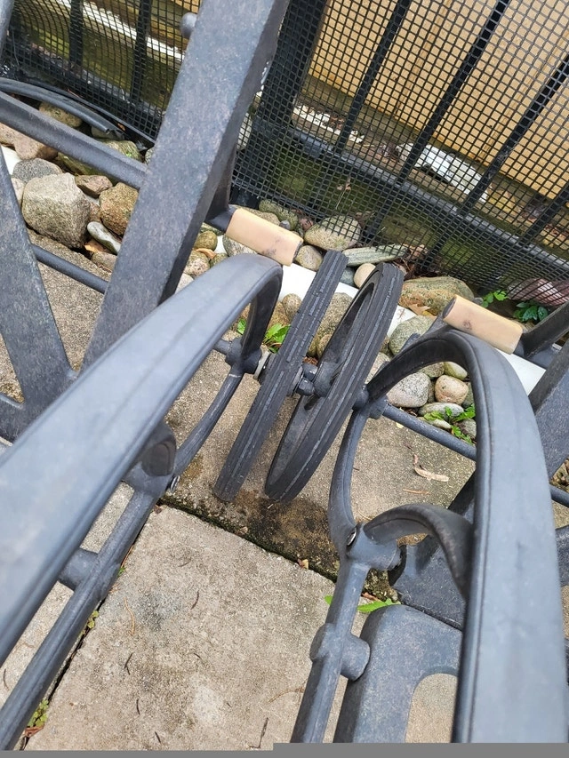 High end patio furniture from Hauser. They have nice big wheels to maneuver easily. One has a break on the upper right, priced at $250 for that one (see last picture). It is repairable and not visible with a cushion. Nice big oversized chairs.