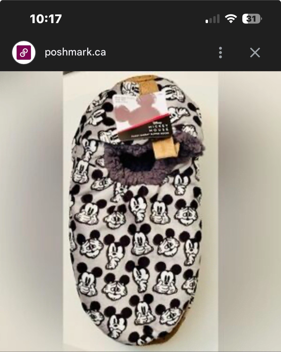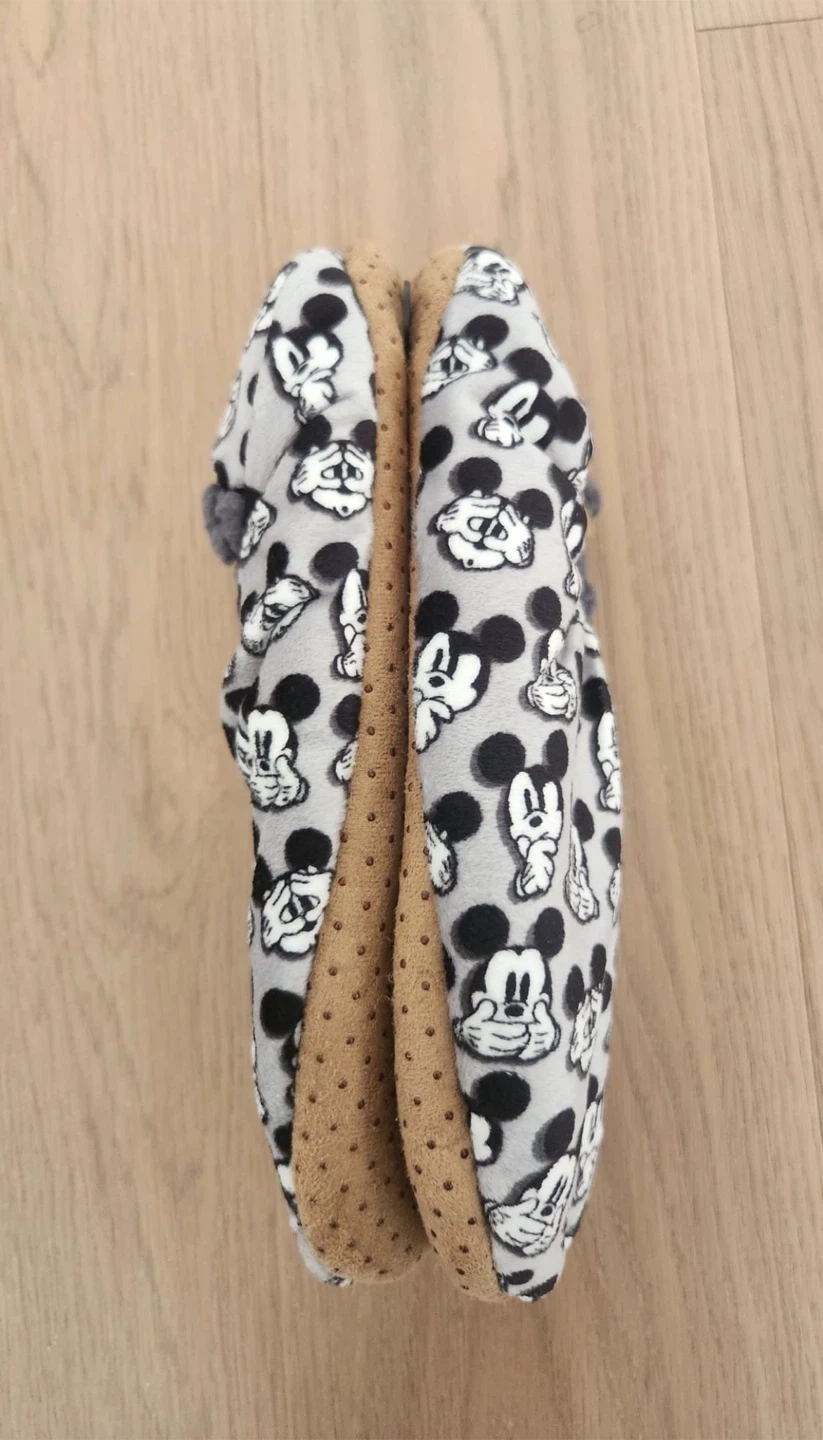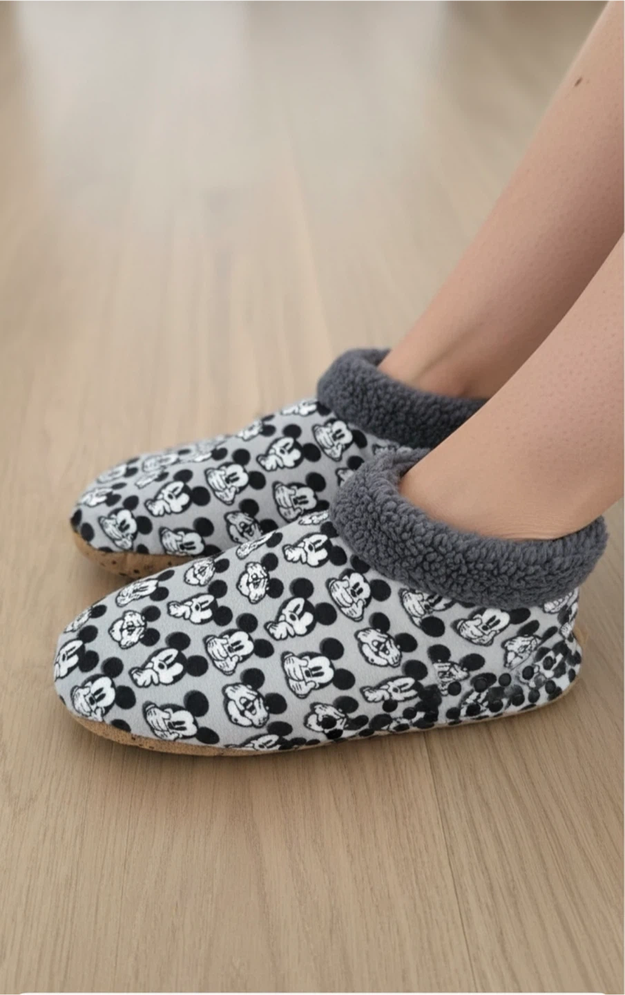 Disney Mickey Mouse fuzzy slipper socks. Soft grey fabric with a fun all-over Mickey print. Features a cozy Sherpa-style lining and grippy sole for traction. Perfect for keeping your feet warm and comfy!