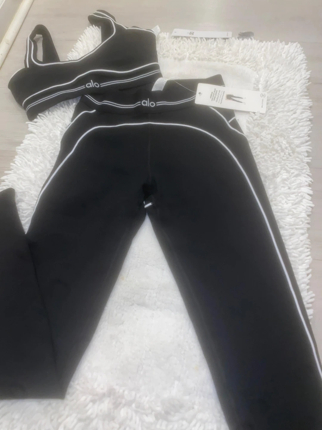 This Alo Yoga set includes a black sports bra and matching leggings with white trim detailing. Both pieces feature the Alo Yoga logo. Perfect for workouts or athleisure wear!