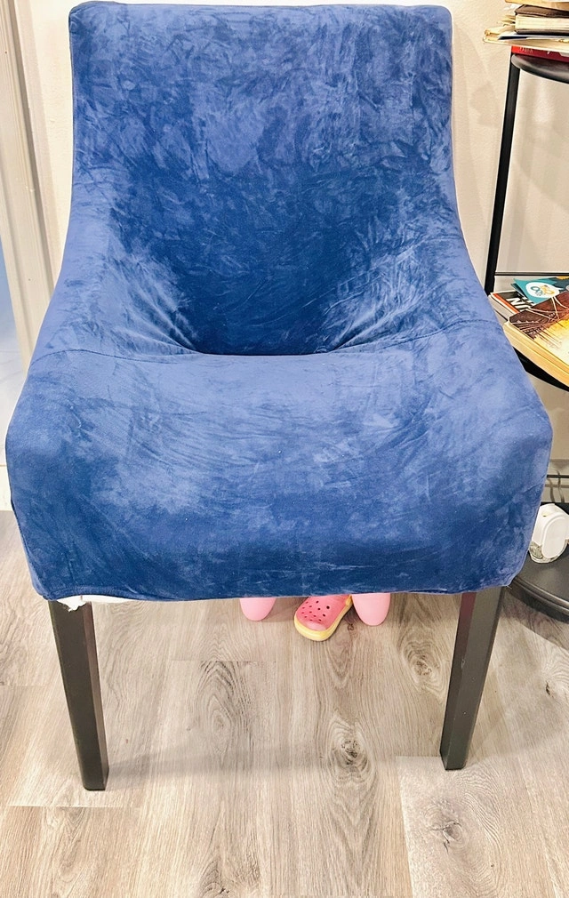 Give your dining room chairs a fresh, new look with these navy blue velvet chair covers. These covers stretch to fit armless wingback chairs, offering a soft and stylish makeover. They're easy to install and removable, making them a practical choice for protecting your chairs and updating your decor. This item is in used condition. Unfortunately, I don't have specific dimensions or material details available, but they're designed to fit standard side chairs. If you see this ad, these chair covers are still available, ready to transform your chairs! Cash accepted.