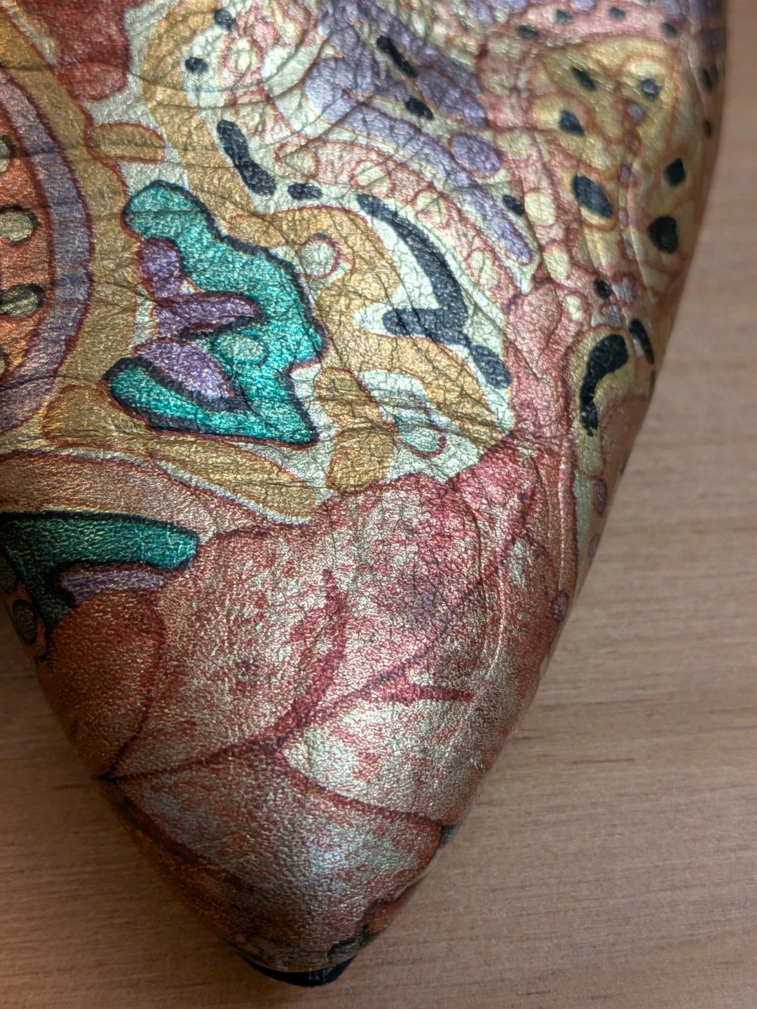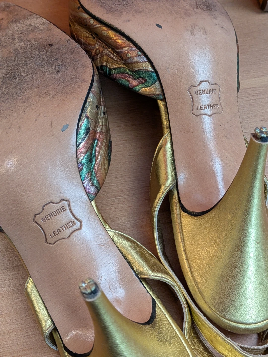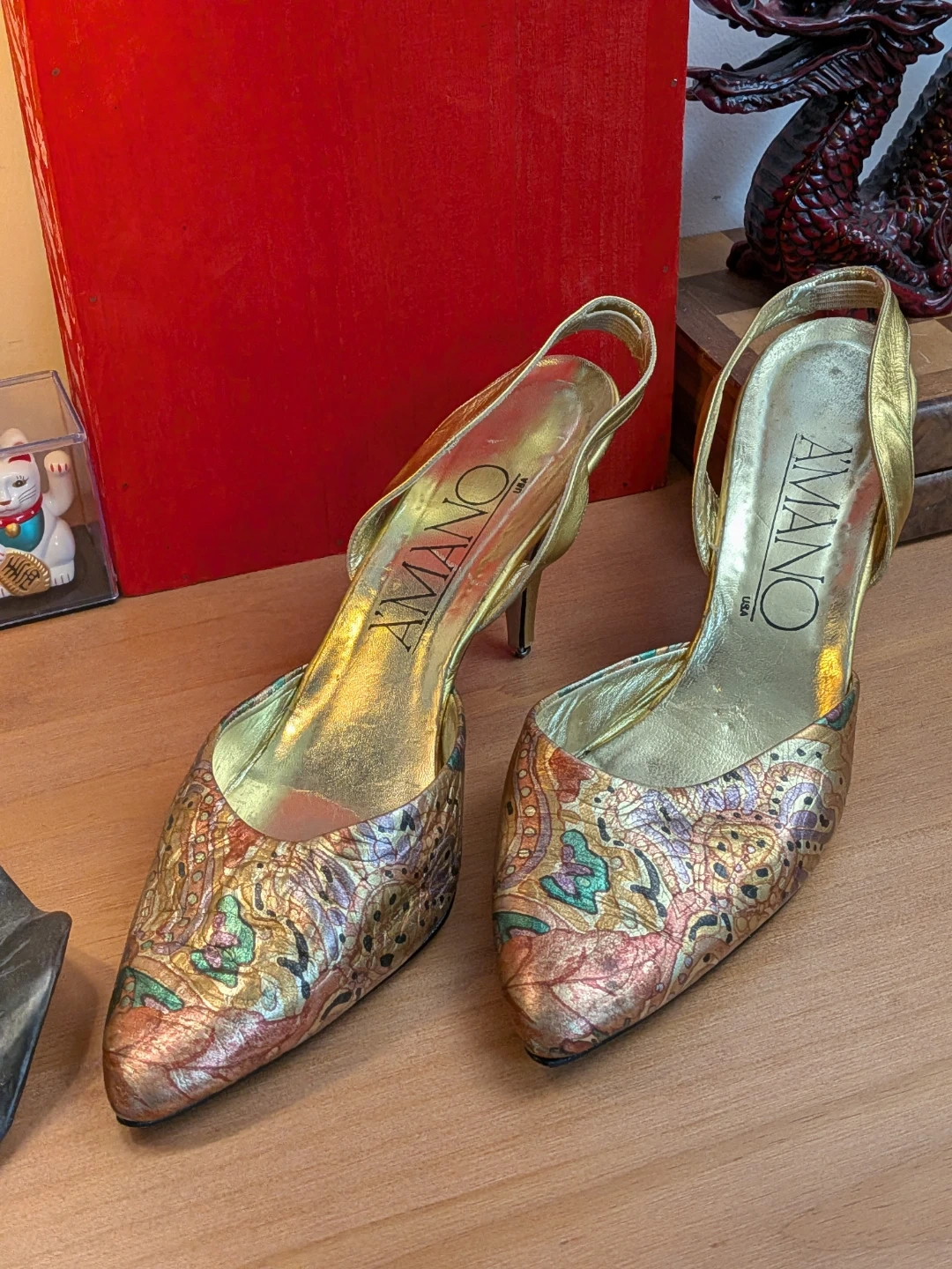 Vintage "A'mano" genuine leather slingbacks, 3" heel, in a beautiful warm gold tone with a fun colourful pattern on the toe~ Glitzy yet not overly flashy π
