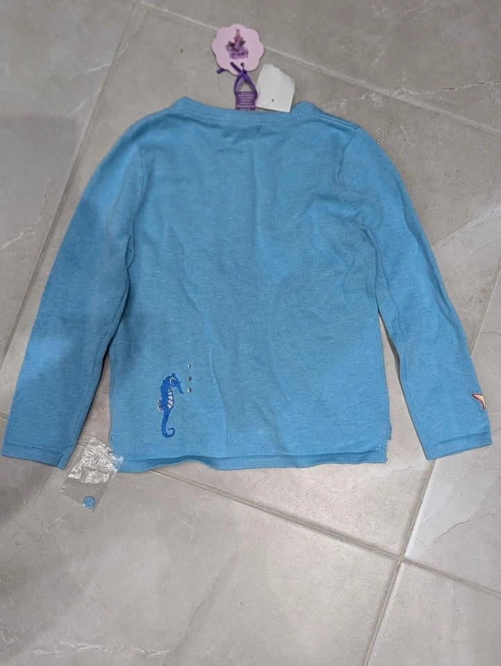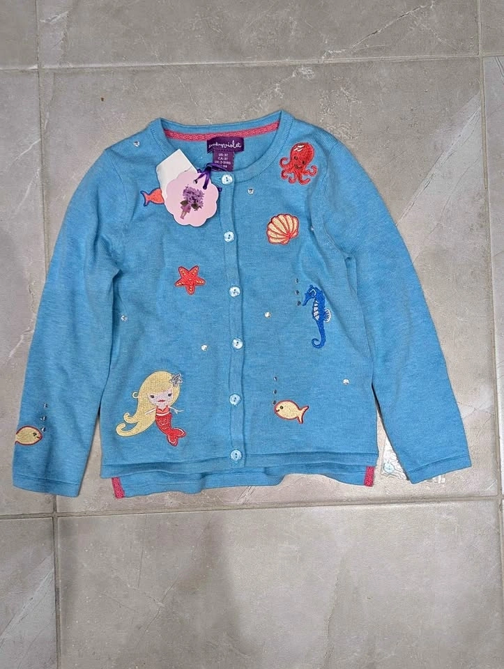 Aqua cardigan, size 3T. Features mermaid and sea creature embroidery. 100% cotton. Extra button included. New with tags.