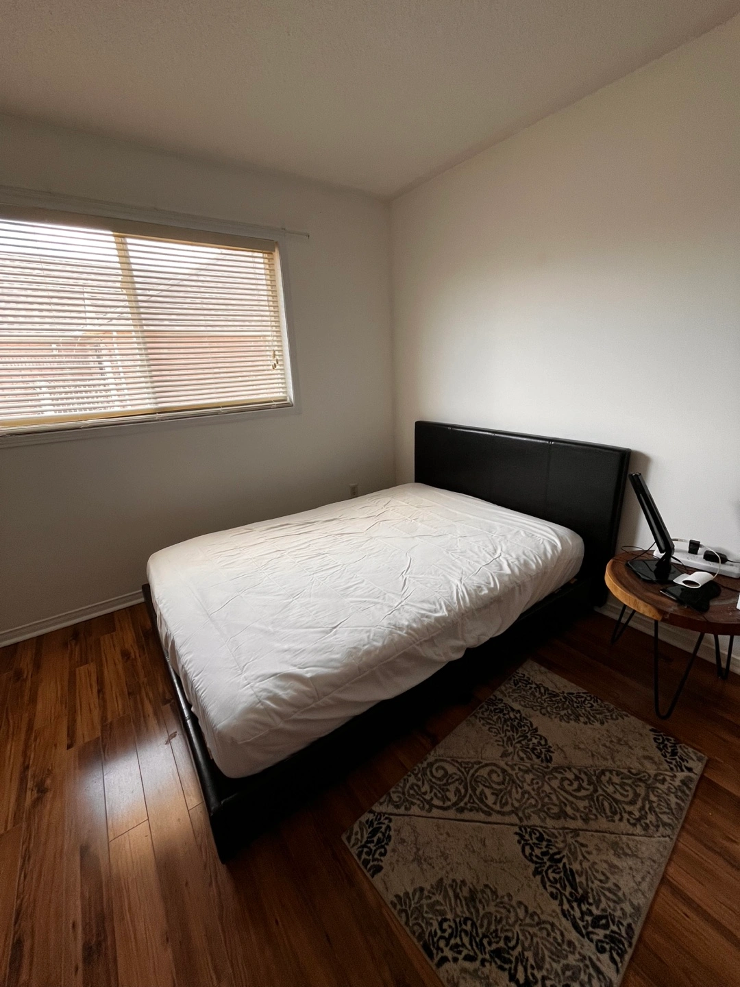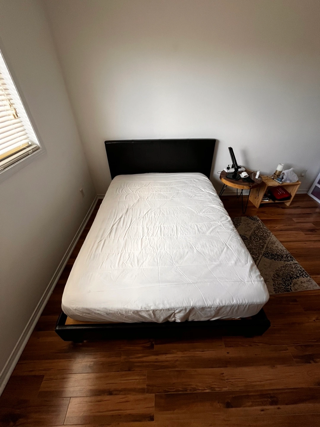 Double bed frame, black faux leather headboard. Simple design, platform bed. Good condition.