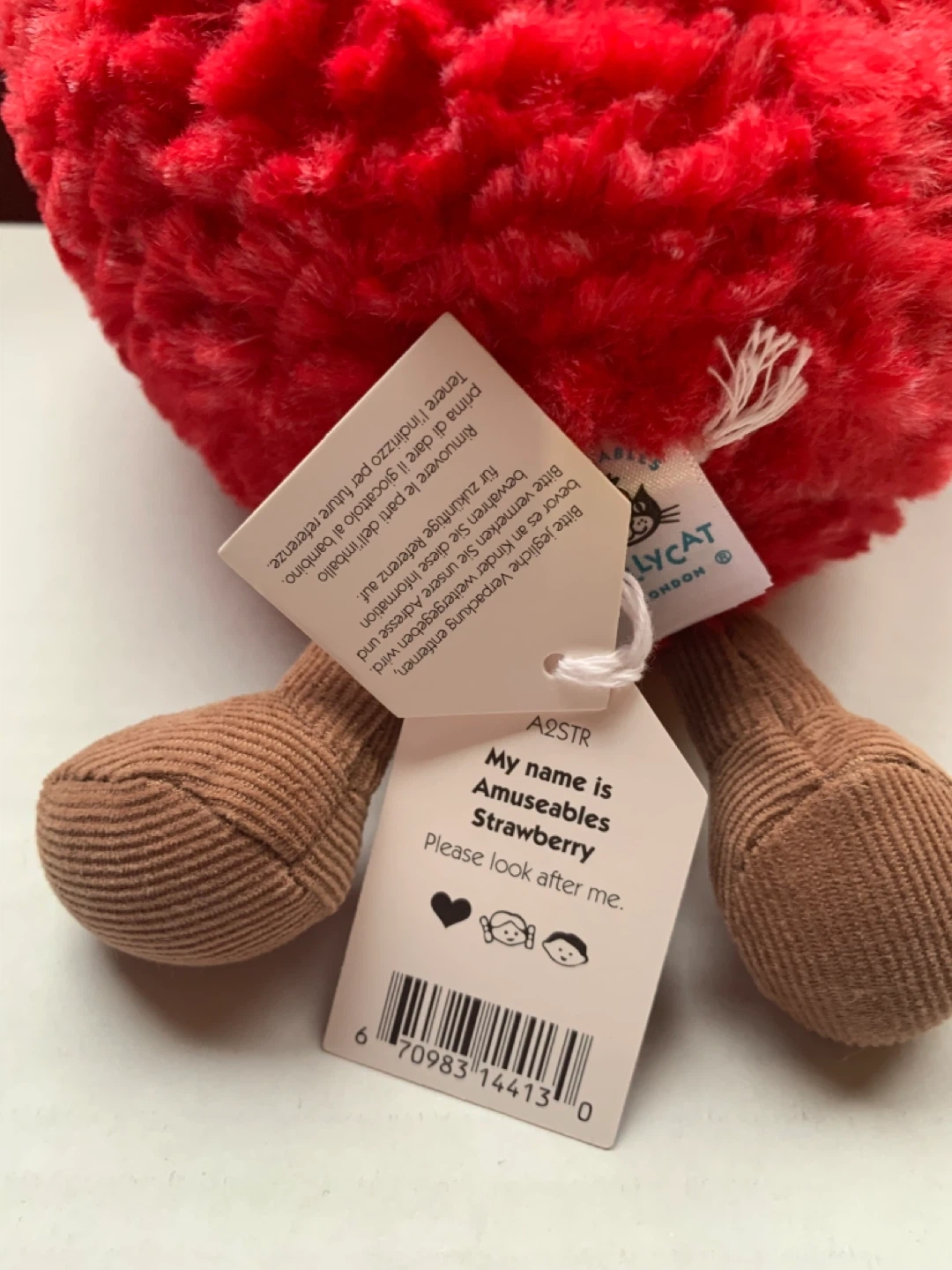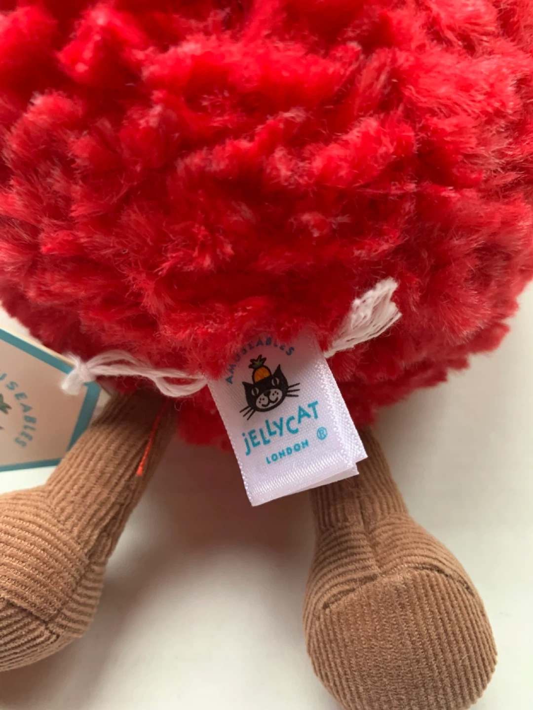 This is a Jellycat Amuseables Strawberry plush. It's super soft and cuddly with a friendly face and corduroy legs. Perfect for strawberry lovers of all ages!