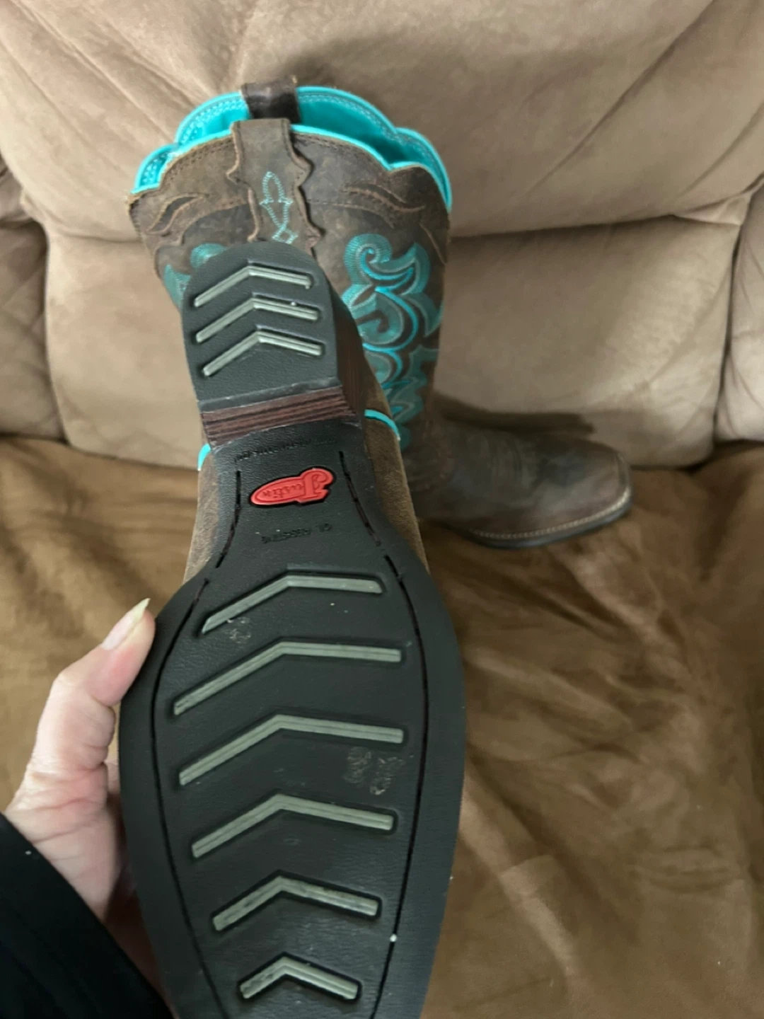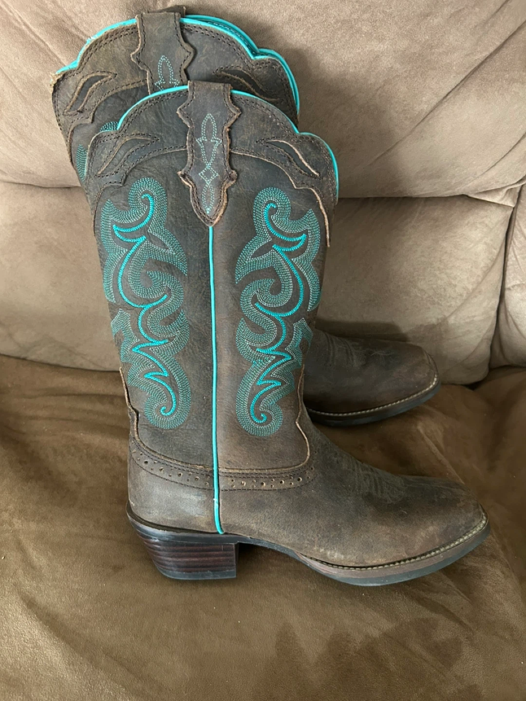 These Justin cowgirl boots are a rich brown with striking turquoise embroidery. They feature a classic Western design with sturdy soles and a comfortable heel. Perfect for rodeos or everyday wear!