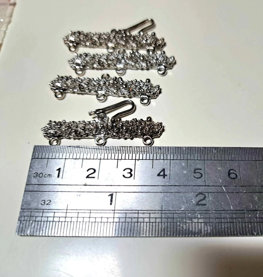 Silver plated set with hooks, 4 pieces per bag. Two are 1960's style! Measures 3.65 cms. These are large, suitable for big beads. Also includes a bag of brass fittings/settings for soft soldering costume jewelry, in 7mm & 12mm sizes.