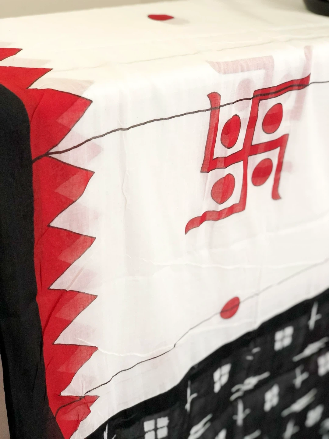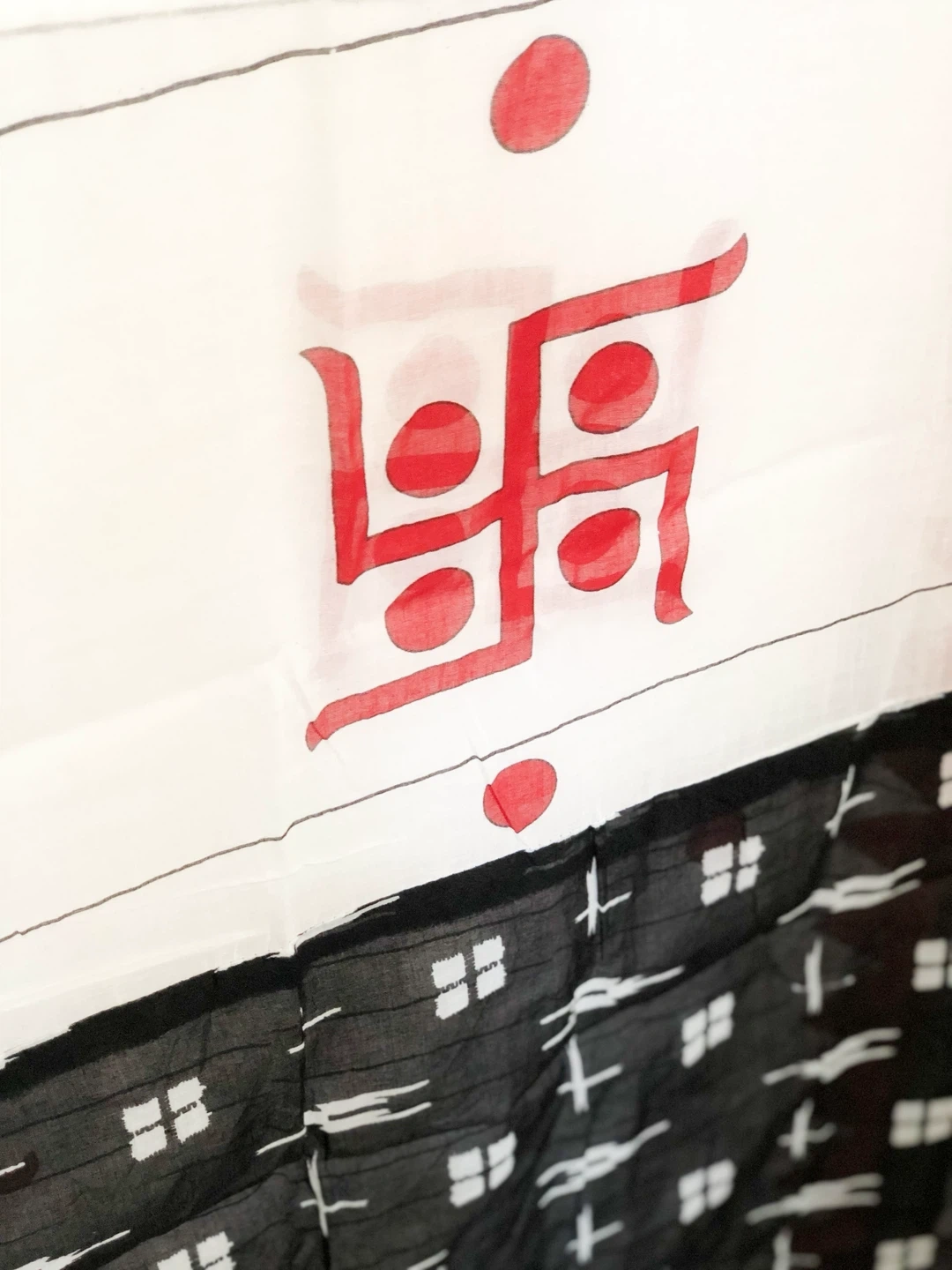 This is a white cotton mulmul saree featuring a red swastik motif and a decorative red and black border. It includes the print blouse. It's a lightweight fabric, perfect for cultural events.