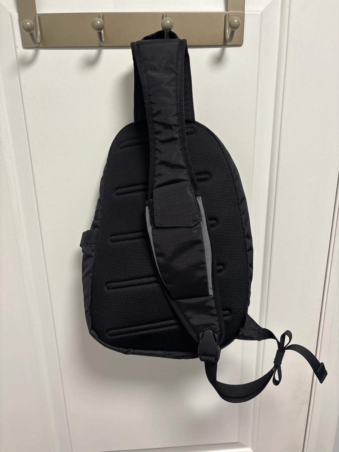 Black sling backpack with multiple pockets (including bottle and phone pockets) and adjustable strap.