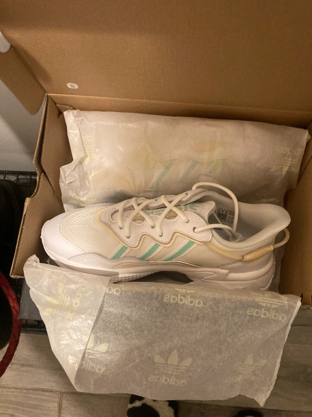 Selling a pair of Adidas Ozweego W women's sneakers in size 7.5 US. They come with the original box! The colour is white/yellow/green.